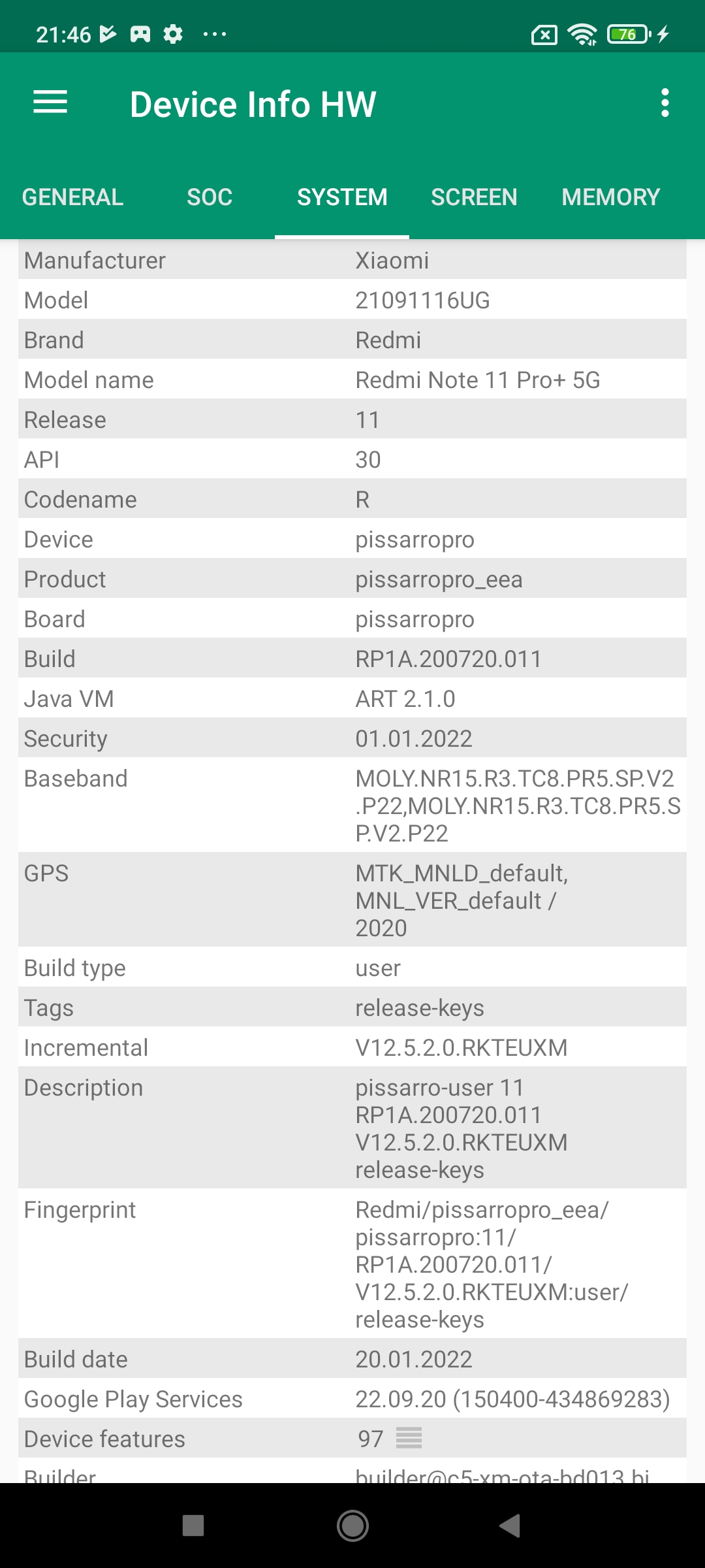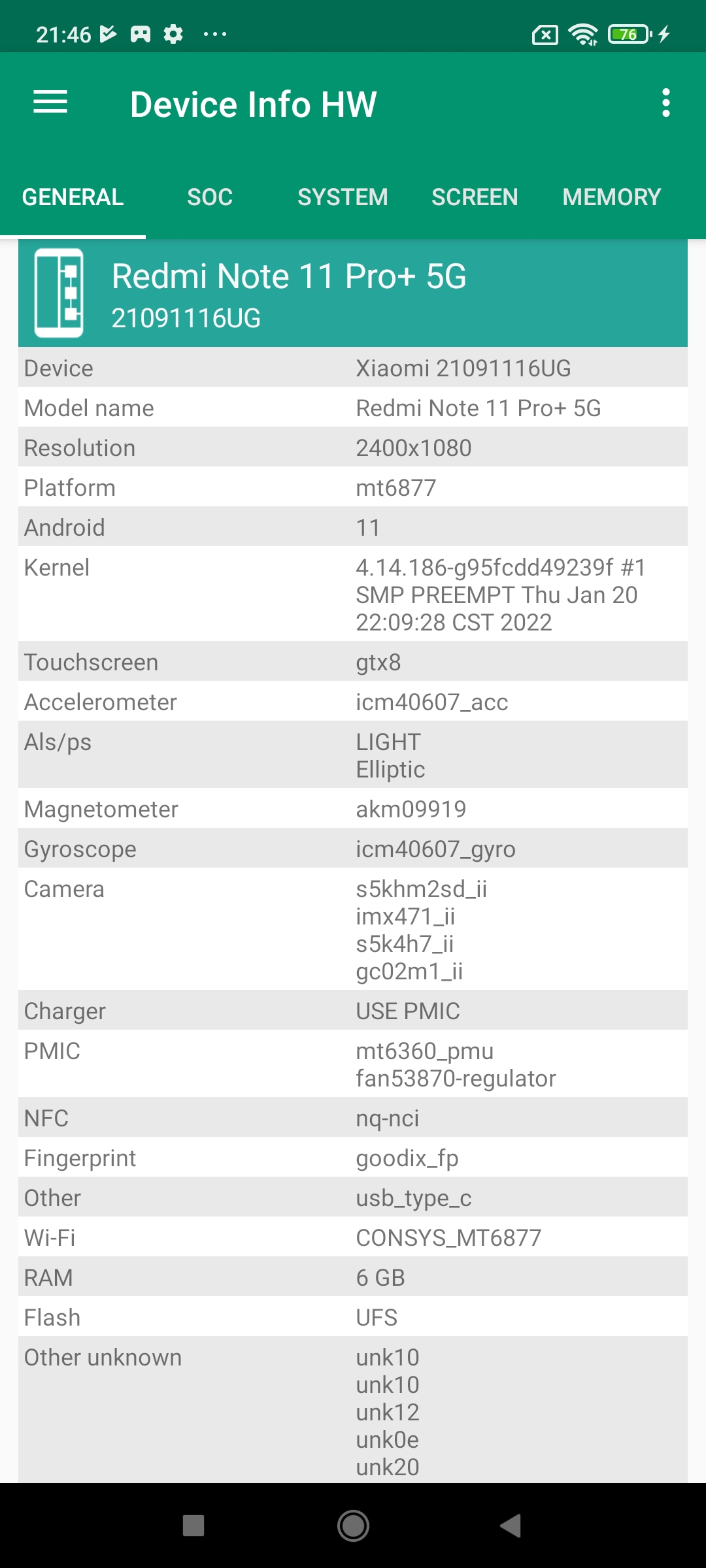 Les informations ci-dessous proviennent de l'application Device Info HW. L'application fournit des informations techniques détaillées sur le téléphone testé.Comme je l'écrivais plus haut, le Redmi Note 11 Pro+ se distingue de la version précédente par le matériel utilisé. Il y a d'abord le choix pour une architecture Mediatek mais je reviens sur ce point plus loin dans le test. Je constate quelques autres différences et notamment au niveau de l'appareil photo. Il s'agit du même capteur que le Redmi Note 11 Pro mais il s'agit d'une déclinaison différente.