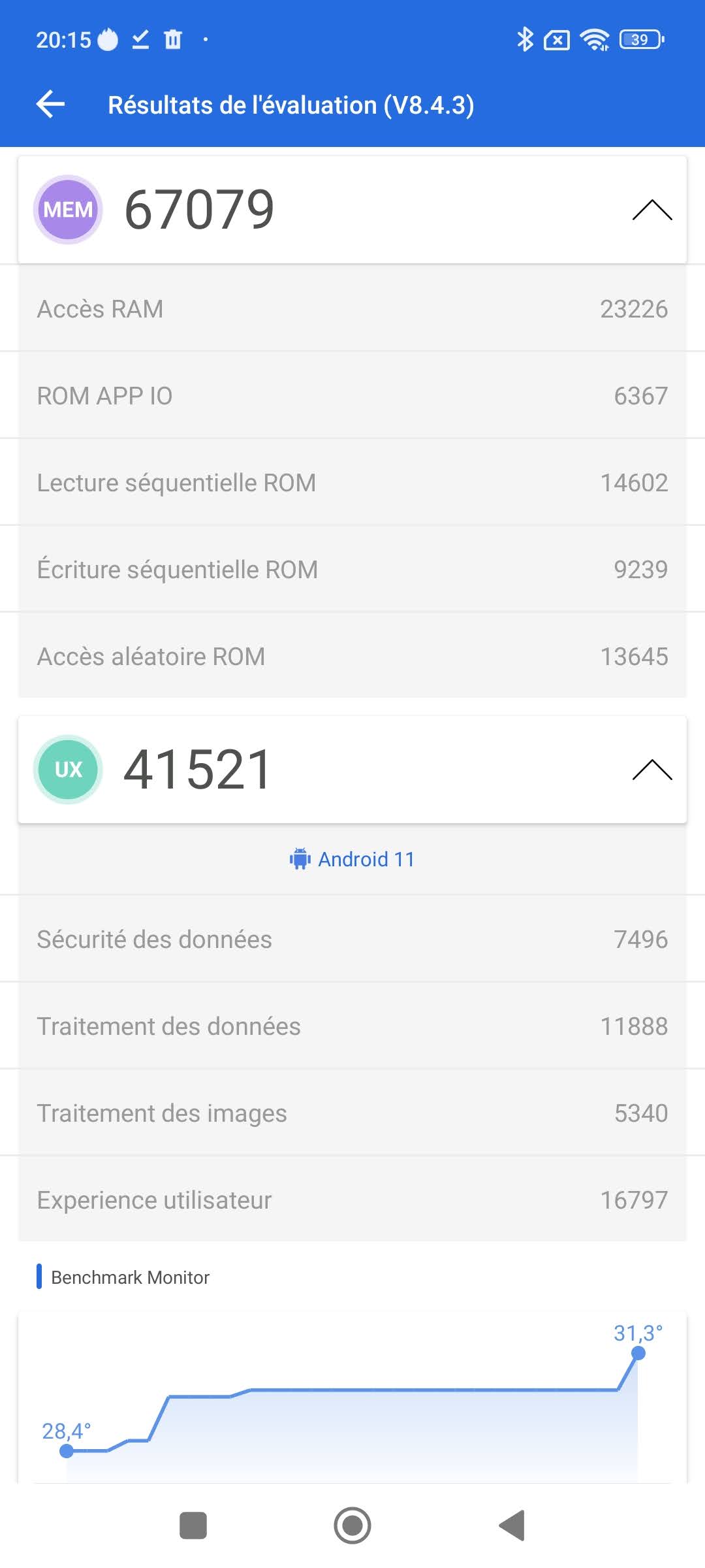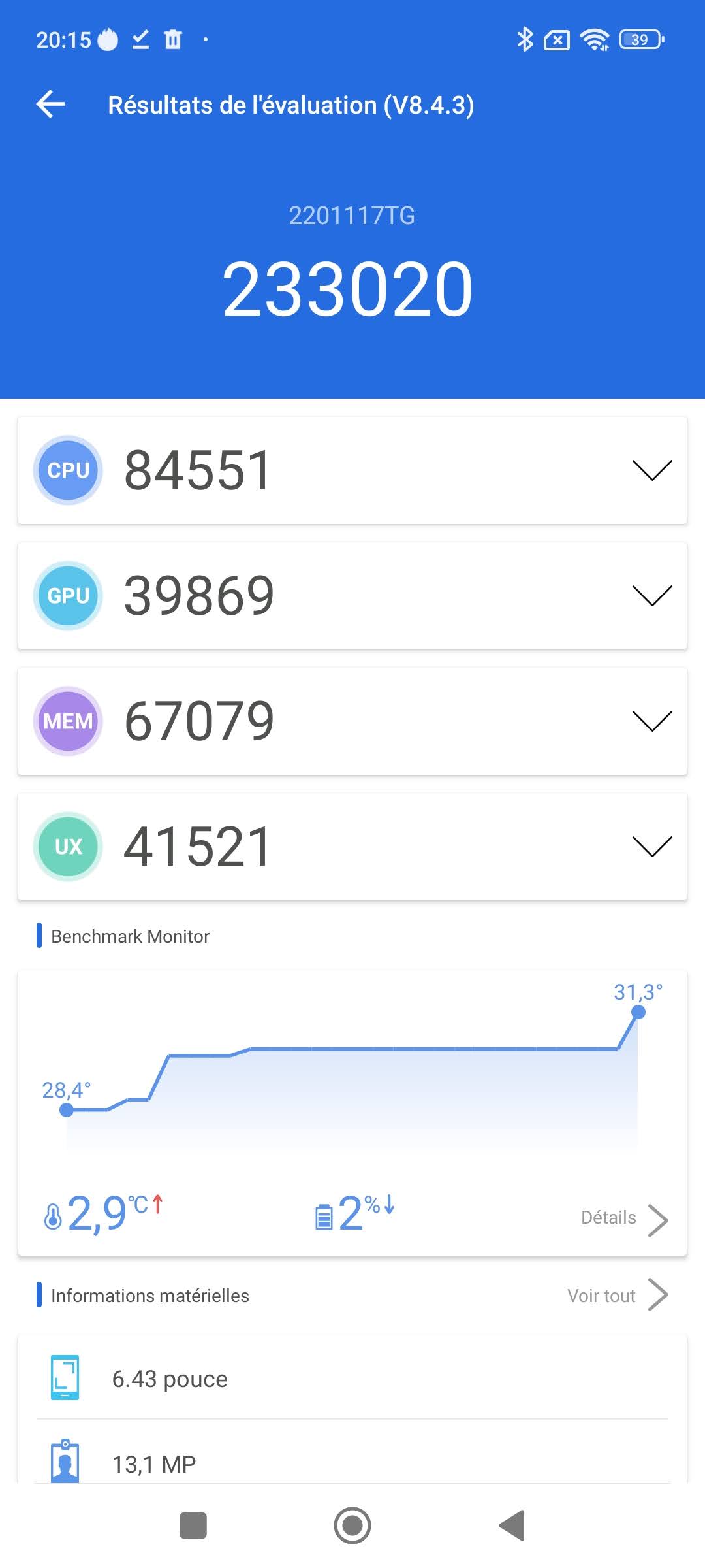J'ai obtenu un score de 233 000 points avec Antutu, j'avais obtenu un score de 225 000 points avec la génération précédente. Le gain en performance n'est donc pas réellement visible mais il est possible que ce processeur soit plus efficace sur le plan énergétique, cela se verra dans les tests de la batterie. Ce score montre que c'est avec la mémoire que ce modèle se démarque de son prédecesseur avec 67 000 points là où j'avais obtenu 48 000 points avec le Redmi Note 10.La performance n'a jamais été l'atout de la gamme Redmi Note, ceux qui cherchent la performance dans la même gamme de prix doivent s'orienter vers la marque Poco. Ce manque de performance est cependant tout à fait relatif car le Redmi Note 11 répondra parfaitement aux besoin d'une population cherchant un téléphone pas trop cher, les concurrents ne font pas mieux de toute façon.