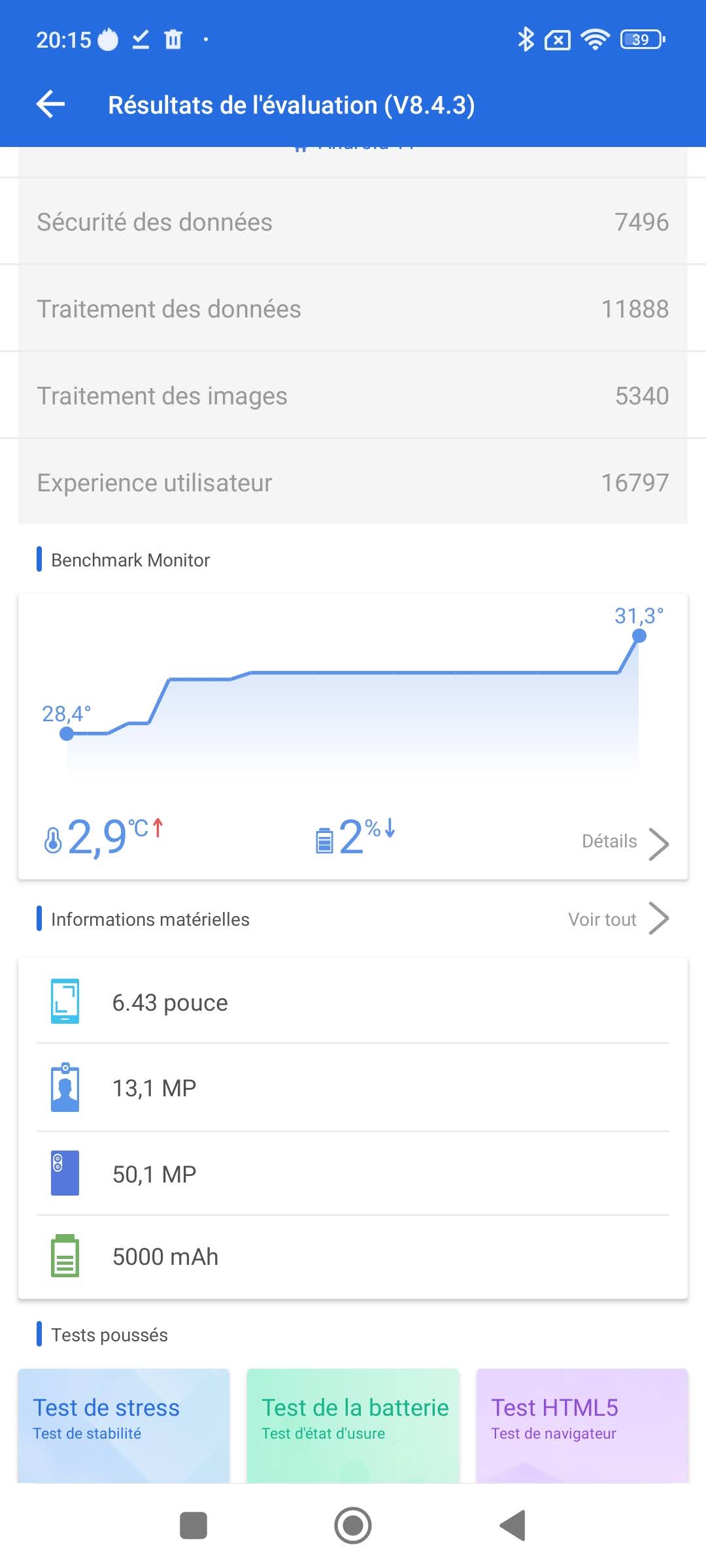 Si j'abaisse la luminosité à 50%, l'autonomie monte à 1376 minutes. C'est un niveau d'autonomie confortable mais qui se situe un peu en dessous de la moyenne des téléphones avec la même capacité de batterie. L'écran est donc plus gourmand sur ce téléphone.