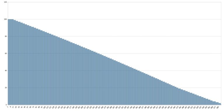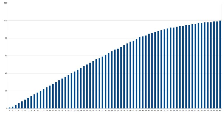 Pour tester l'autonomie des batteries j'ai développé une application qui mesure le niveau de batterie minute par minute jusqu'à ce que la batterie soit vide. Cette application consomme environ une dizaine de pourcent des ressources du téléphone et je fais un test avec une luminosité d'écran à 100% et un autre avec une luminosité à 50%. Ce test vise à reproduire une utilisation contemplative d'un téléphone (ex: surfer sur internet, lire des articles, passer du temps sur les réseaux sociaux). Ces résultats ne sont pas valables pour une utilisation intensive type gaming/streaming. [battery] J'ai mesuré le temps de charge avec un chargeur rapide Ugreen 100W et il m'a fallu 69 minutes pour charger la batterie de 1 à 100%. La charge rapide de 33W du Xiaomi Redmi Note 11 le place parmi les plus rapides dans cette gamme de prix. Sur le graphe suivant, on voit que la vitesse de chargement n'est pas du tout linéaire, il ne faut que 12 minutes pour charger 20% mais les 20 derniers pourcents prennent 25 minutes. C'est à partir de 80% que la charge ralentit fortement.