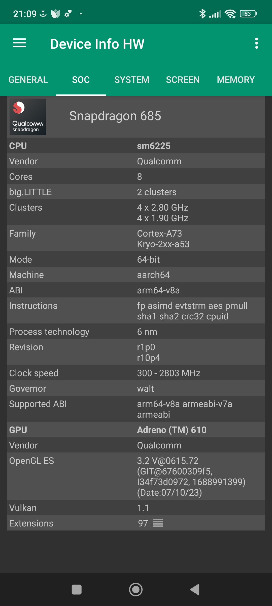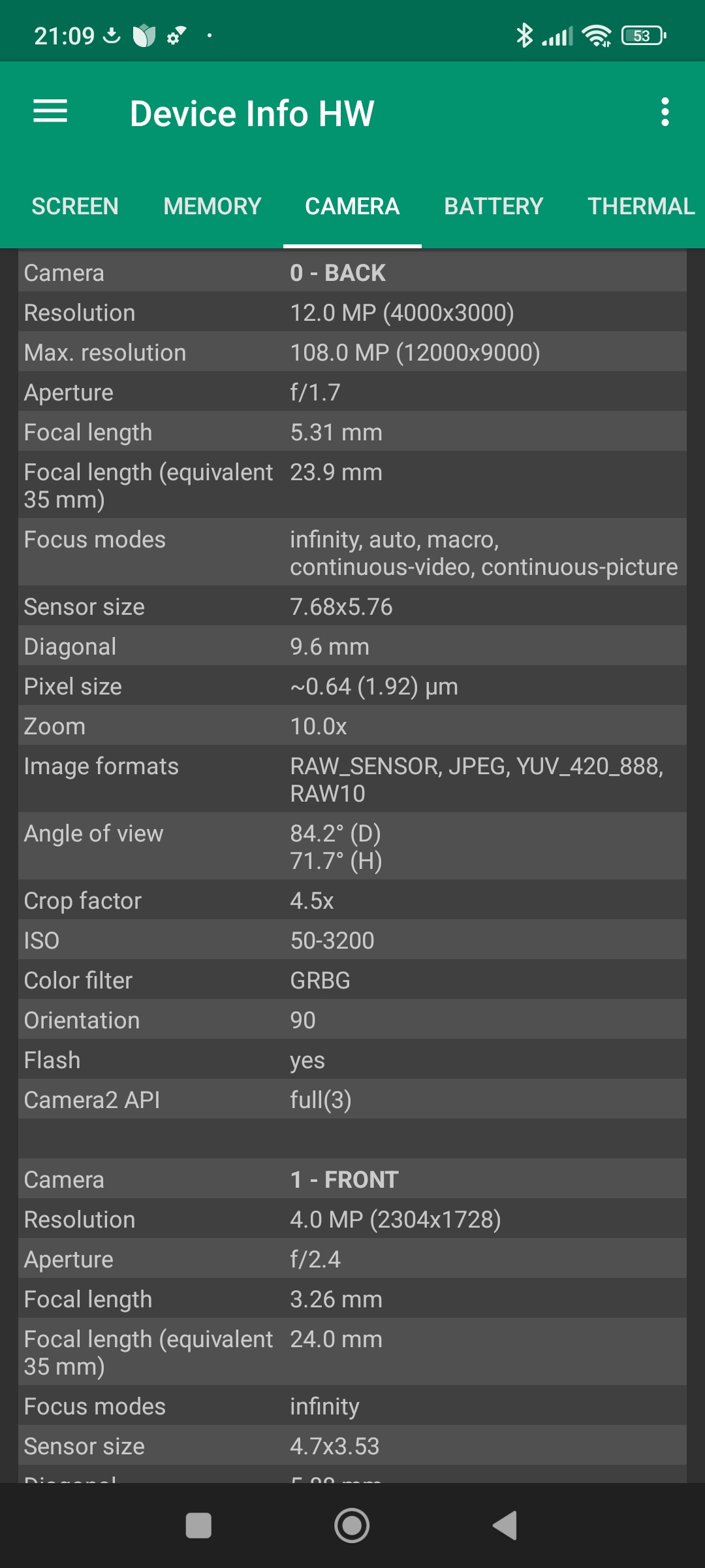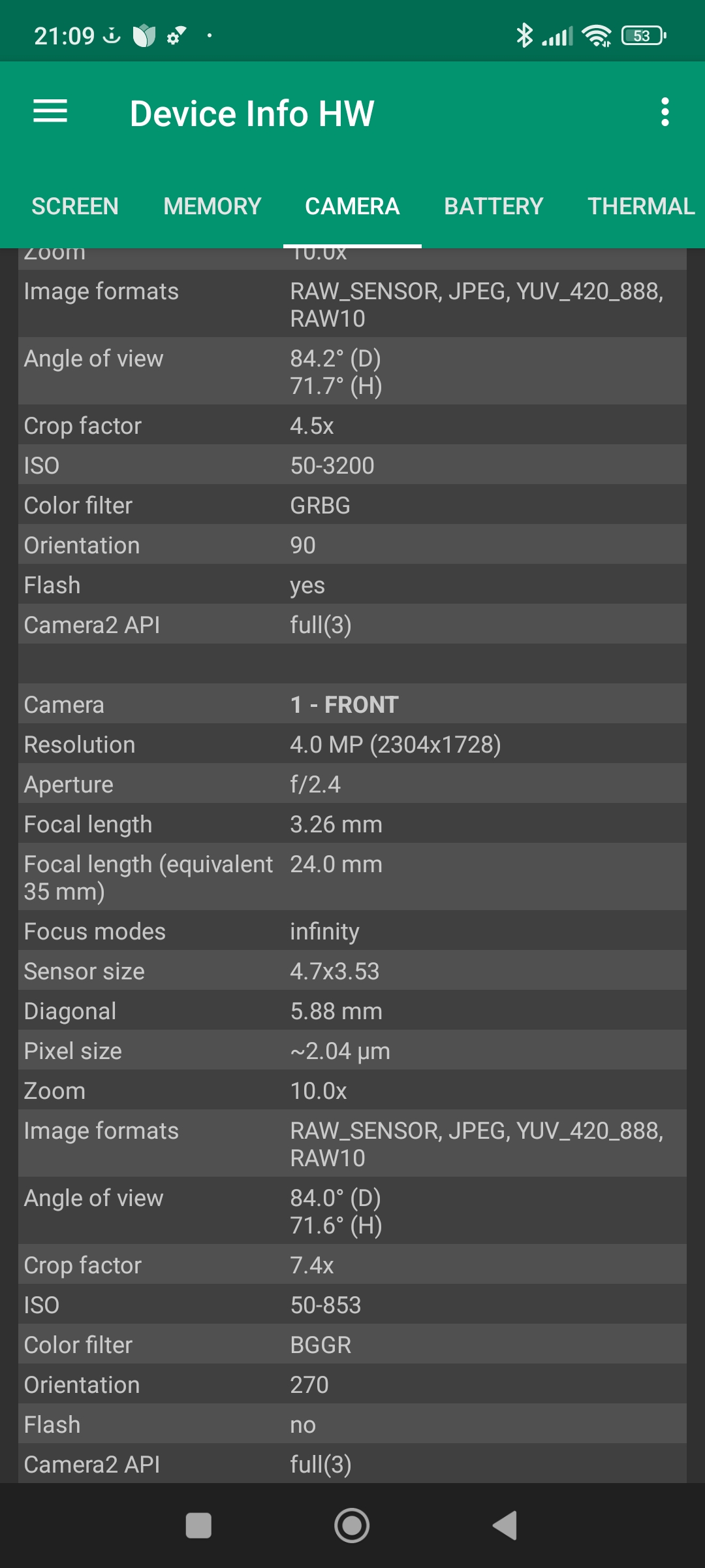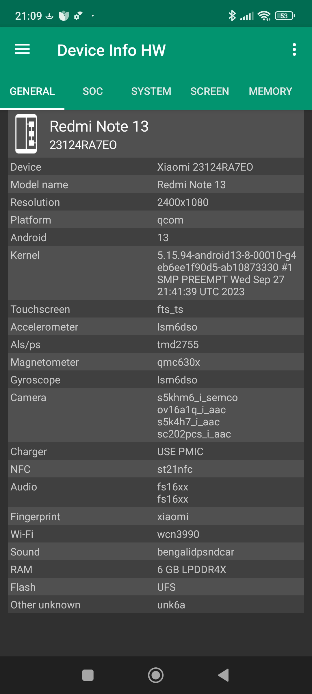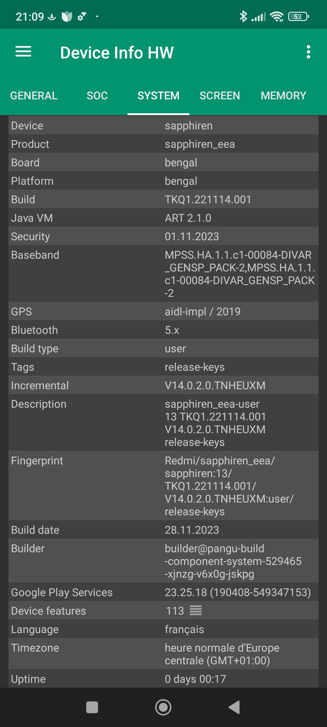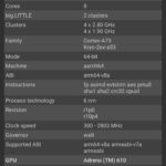 Les informations ci-dessous proviennent de l'application Device Info HW. L'application fournit des informations techniques détaillées sur le téléphone testé.J'ai testé la version 4G de ce téléphone mais il existe une version 5G utilisant une architecture différente.