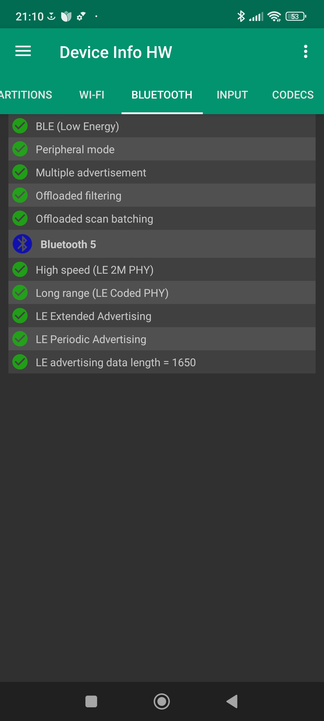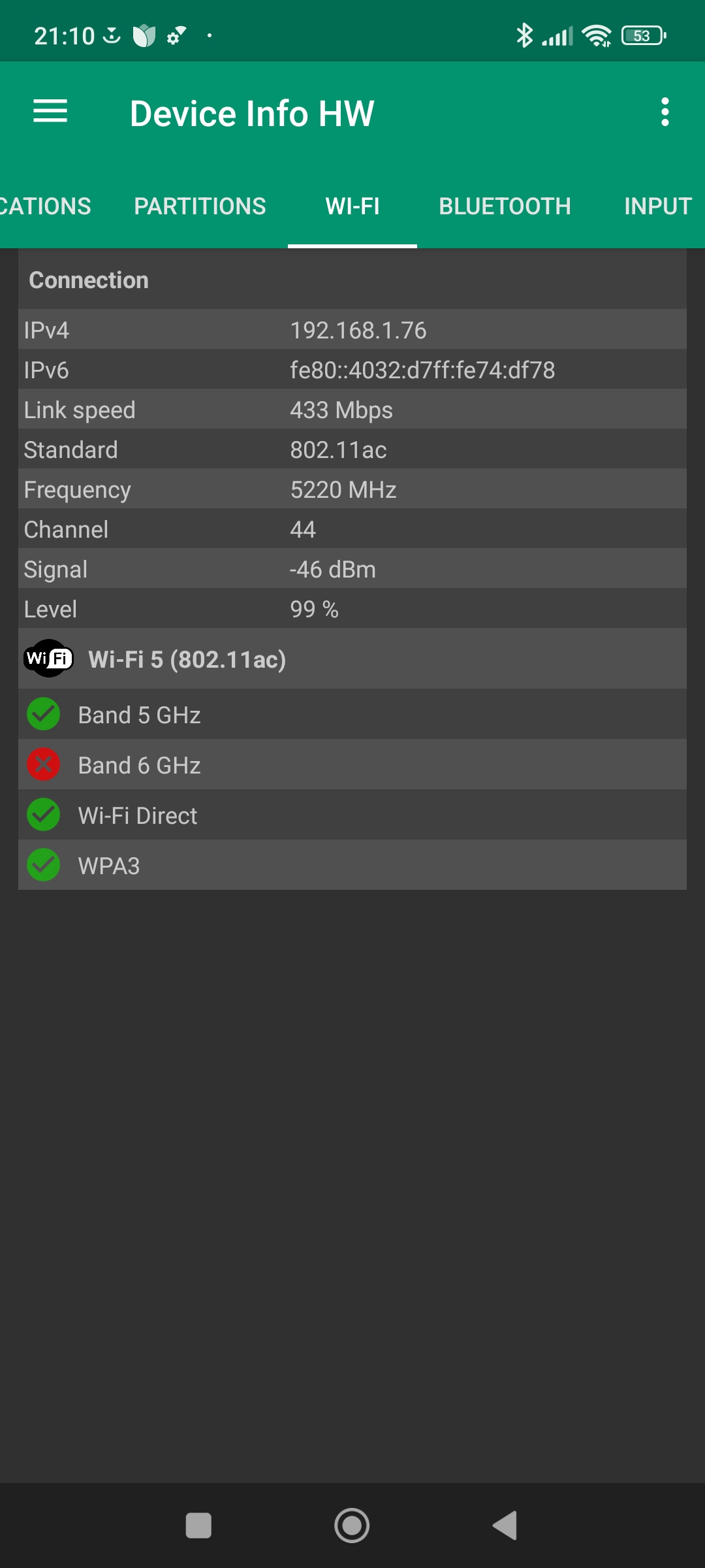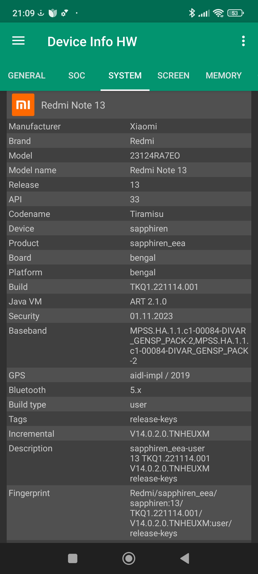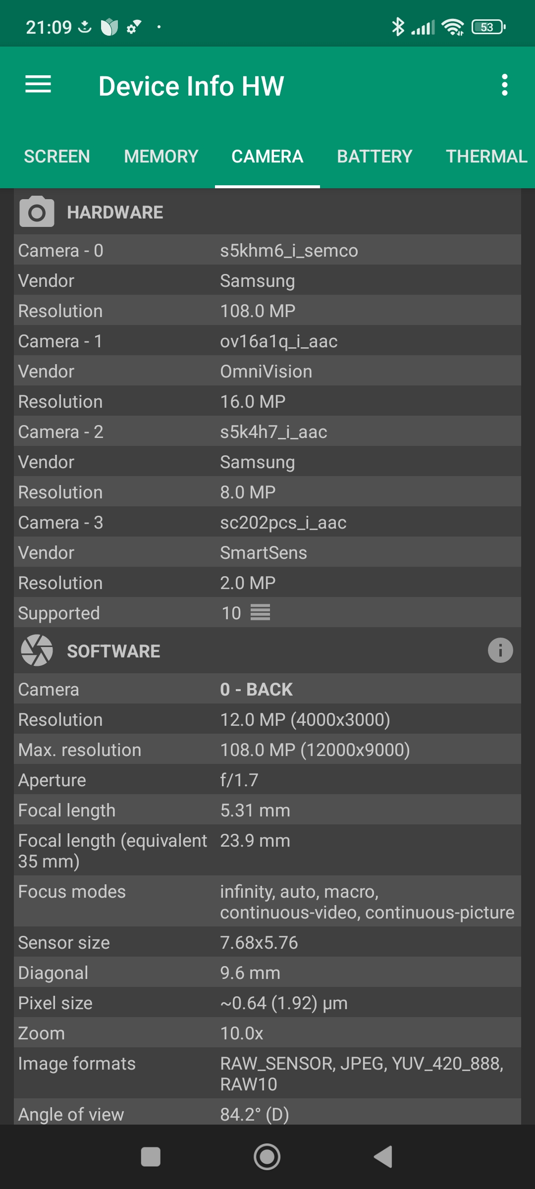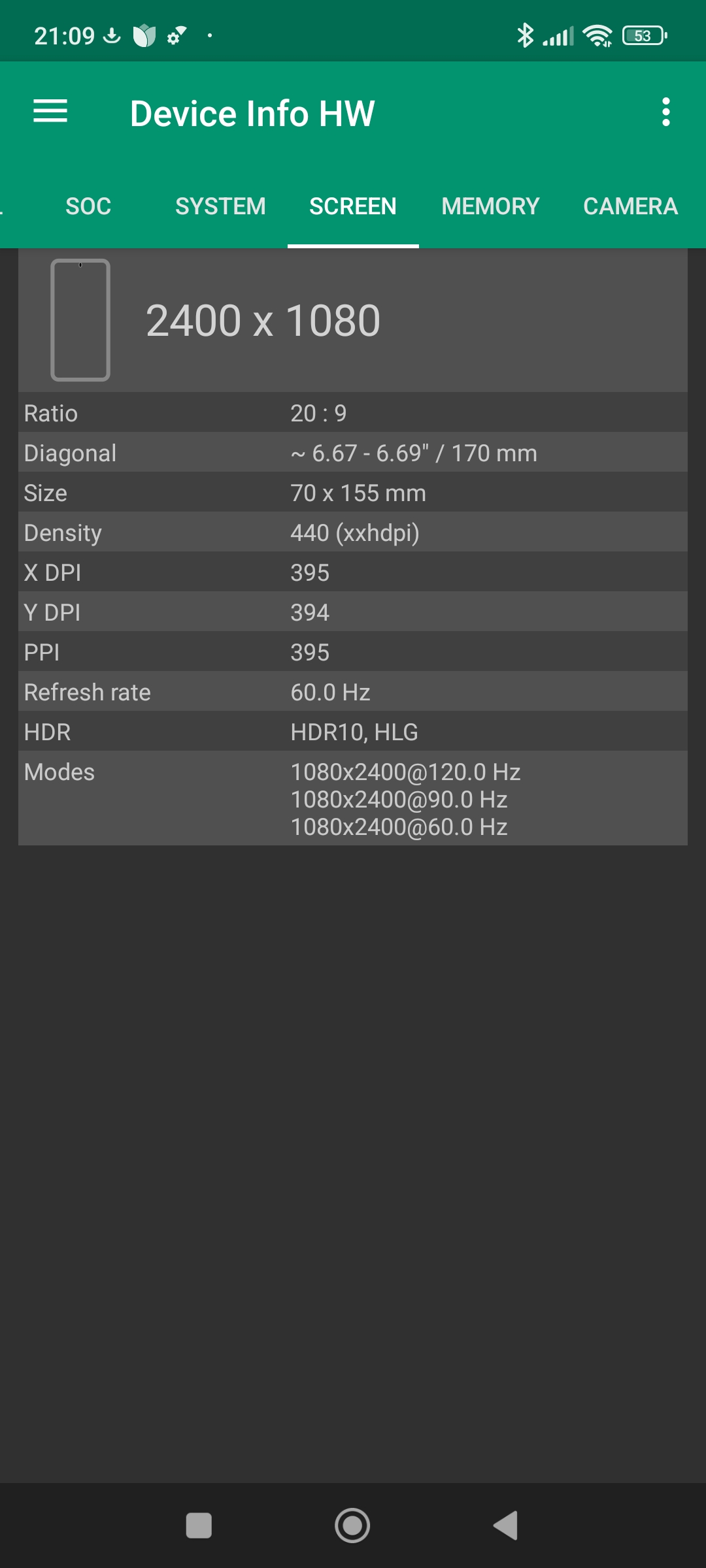 Les informations ci-dessous proviennent de l'application Device Info HW. L'application fournit des informations techniques détaillées sur le téléphone testé.J'ai testé la version 4G de ce téléphone mais il existe une version 5G utilisant une architecture différente.