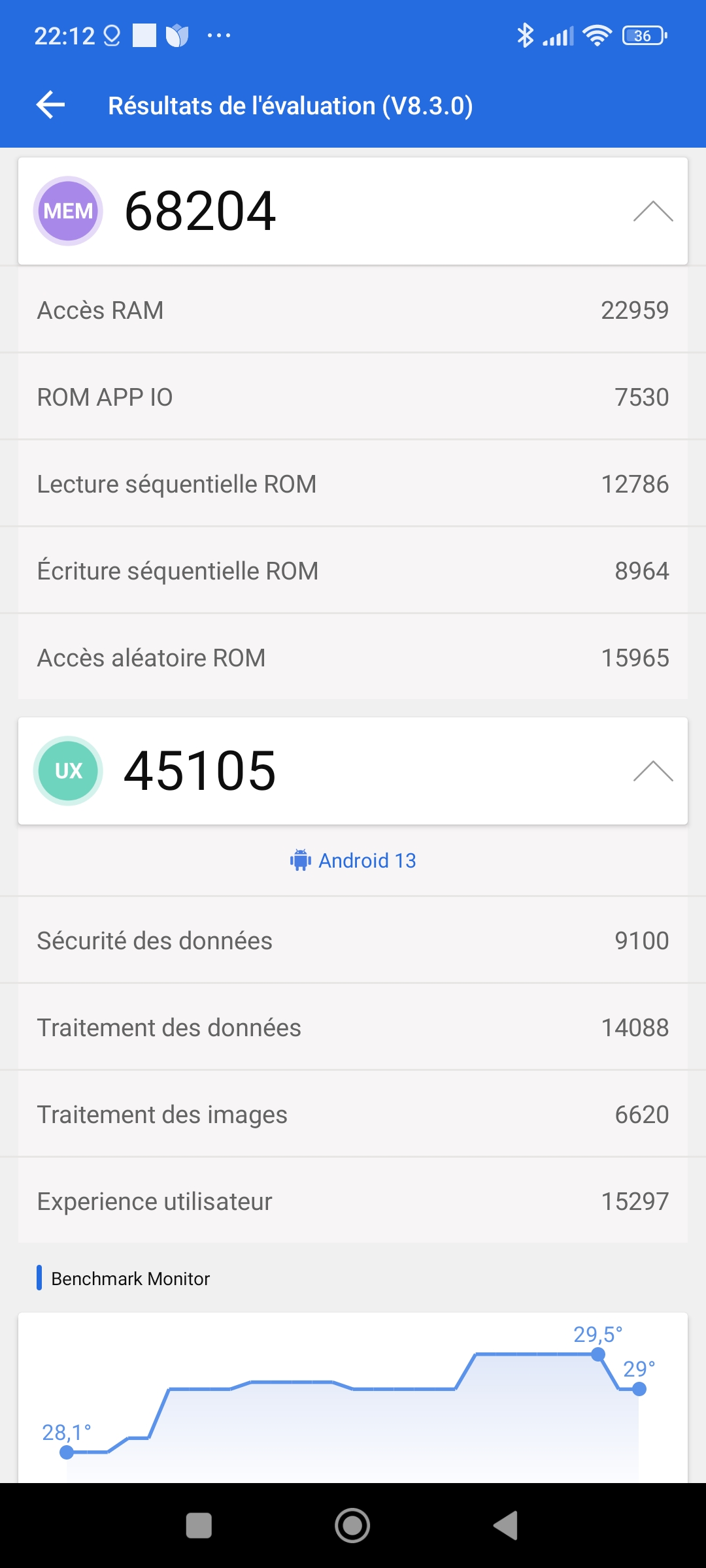 Rien d'extraodinaire ici, ces mesures viennent confirmer la faible performance brute du téléphone. Cela n'a sans doute aucune importance si vous voulez juste un téléphone simple mais si vous voulez jouer ou utiliser des applications plus lourdes, il faut s'orienter vers un autre téléphone.
