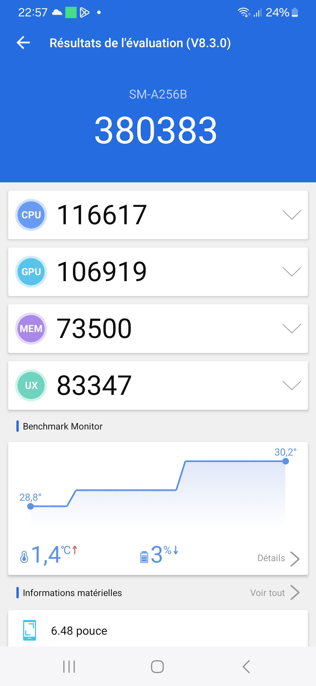 Vous retrouverez les caractéristiques détaillées de ce téléphone dans les écrans suivants, je n'ai rien remarqué de particulier, ce téléphone reprend dans les grandes lignes les composants de téléphones plus anciens chez Samsung. C'est une pratique assez courante qui permet d'obtenir l'équivalent d'un milieu de gamme au prix d'un téléphone d'entrée de gamme.