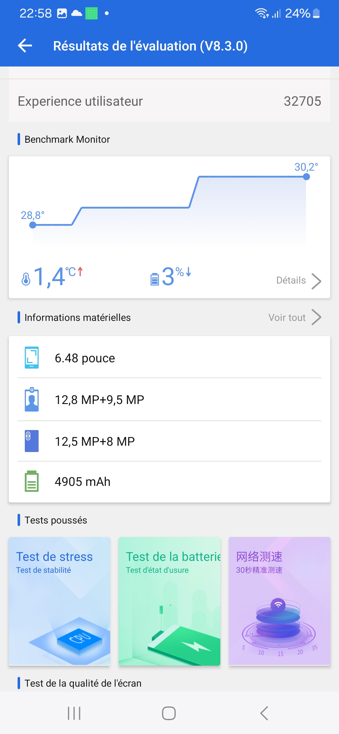 La température de la batterie a atteint 33.6 degrés à l'issue de ce test, c'est une température assez faible par rapport à l'effort que le téléphone a du livrer.