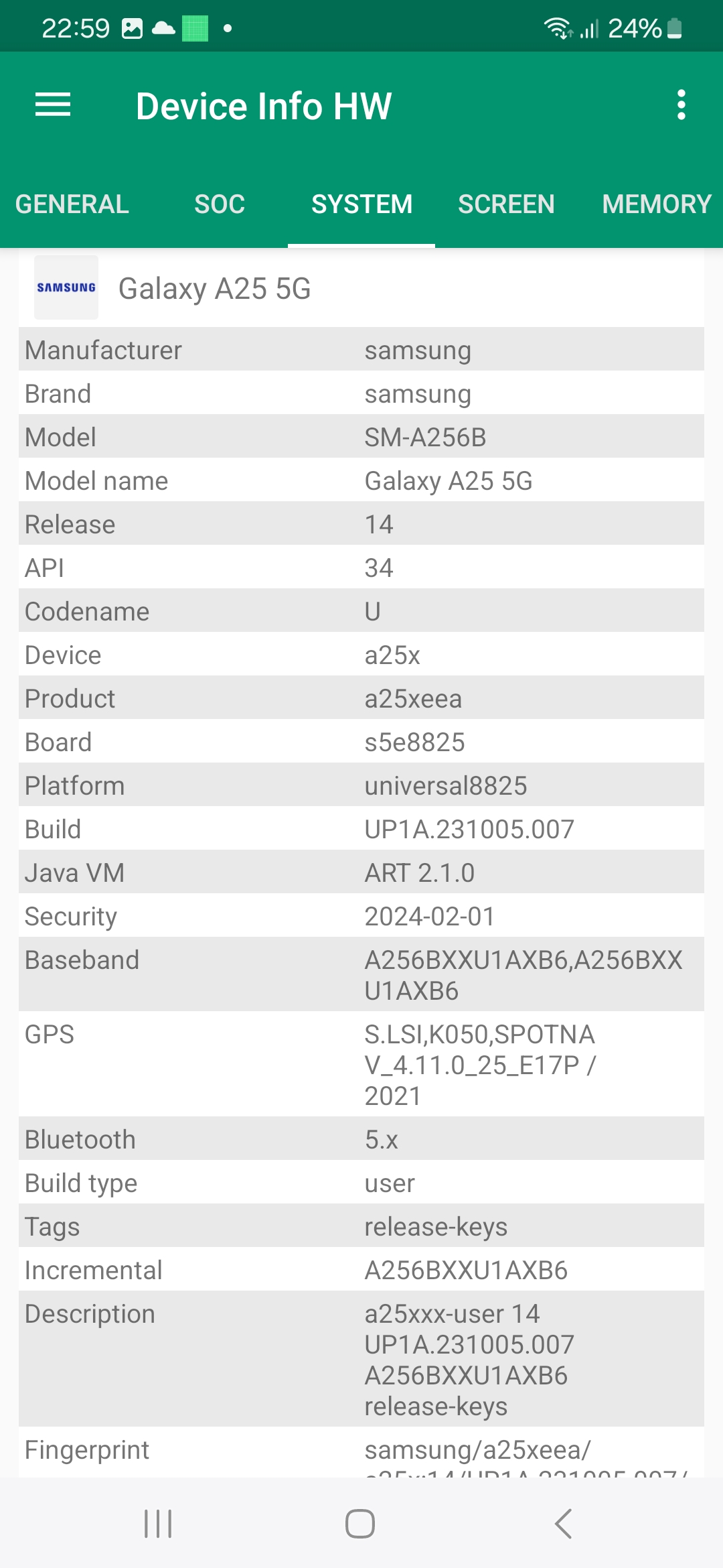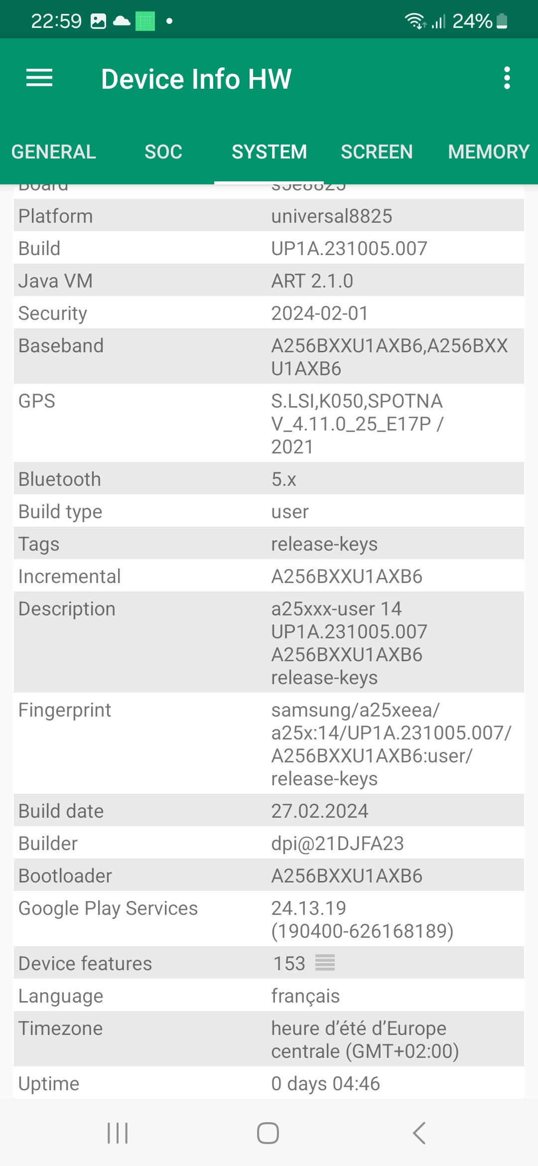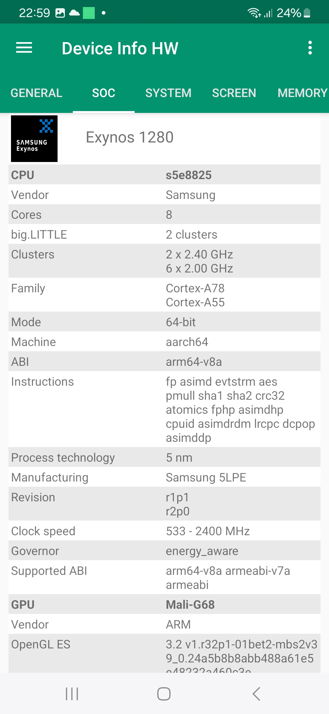 Les informations ci-dessous proviennent de l'application Device Info HW. L'application fournit des informations techniques détaillées sur le téléphone testé.Le Samsung Galaxy A25 tourne sous une architecture Exynos conçu par et pour Samsung, ce type d'équipement n'est donc pas utilisé par d'autres marques. Cela veut dire que le CPU, GPU, FPU, Bluetooth, Wifi, GPS, chipset audio ne pourront être comparés qu'à d'autres téléphones Samsung. Les autres marques ont tendance à utiliser une architecture Qualcomm ou Mediatek ce qui rend la comparaison entre téléphones plus facile. Il faut donc plutôt comparer ce téléphone avec d'autres modèles Samsung comme le Samsung Galaxy A33, Samsung Galaxy A53 ou encore le Samsung Galaxy M34. Ce sont pour la plupart des téléphones lancés il y a deux ans. L'entrée de gamme en 2024 reprend donc du matériel du milieu de gamme de 2022.