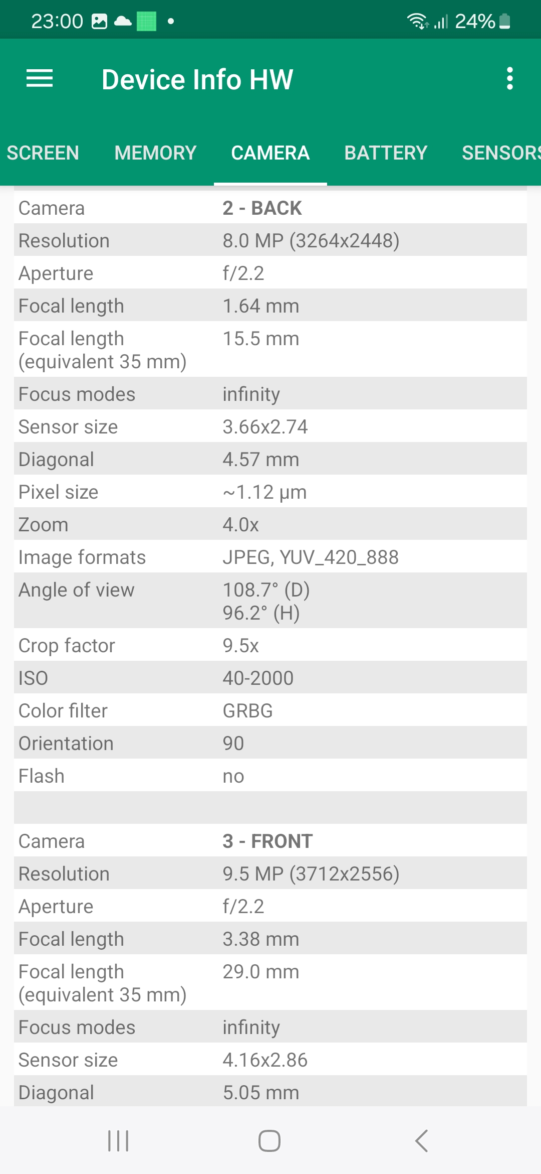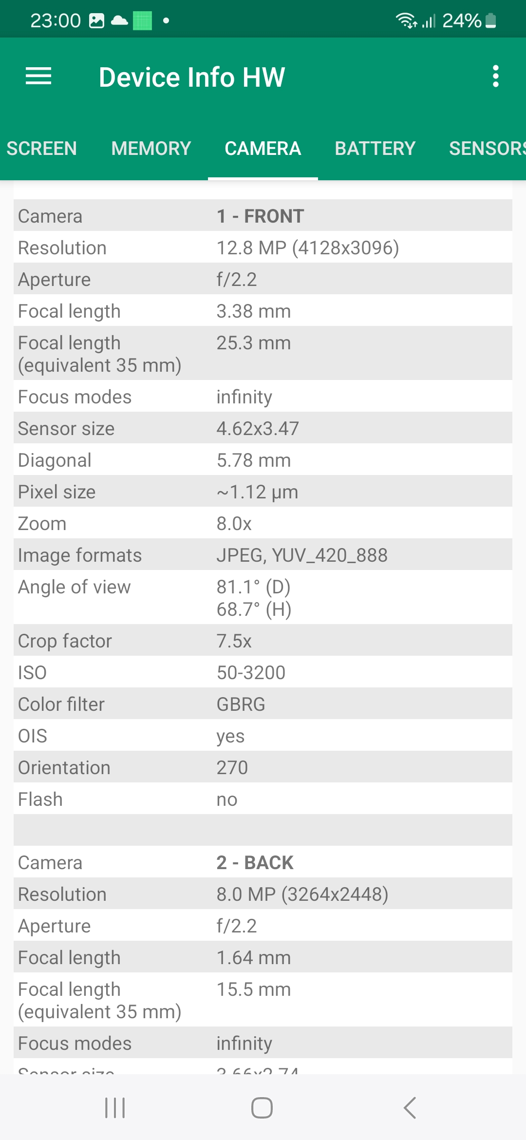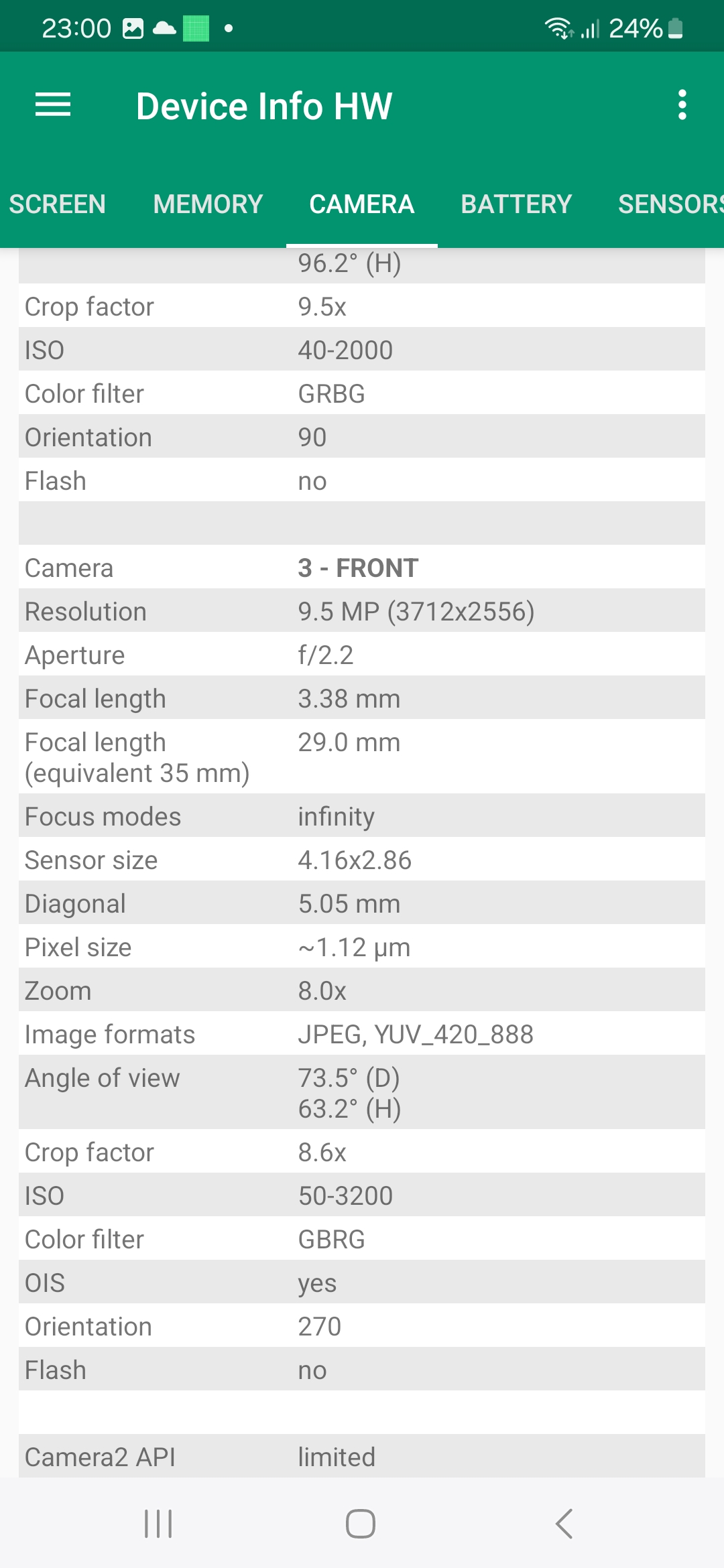 Samsung n'a pas été très explicite dans les caractéristiques techniques des capteurs utilisés sur ce téléphone. Le capteur principal est un capteur de 50 millions de pixels, il s'agit probablement d'un capteur Sony car je ne retrouve pas les mêmes caractéristiques dans la gamme 50 Mp de Samsung.Le capteur secondaire est un capteur ultra grand angle de 8 millions de pixels qui aurait pu être un Sony IMX 355 mais ici aussi les caractéristiques ne correspondent pas avec ce modèle.