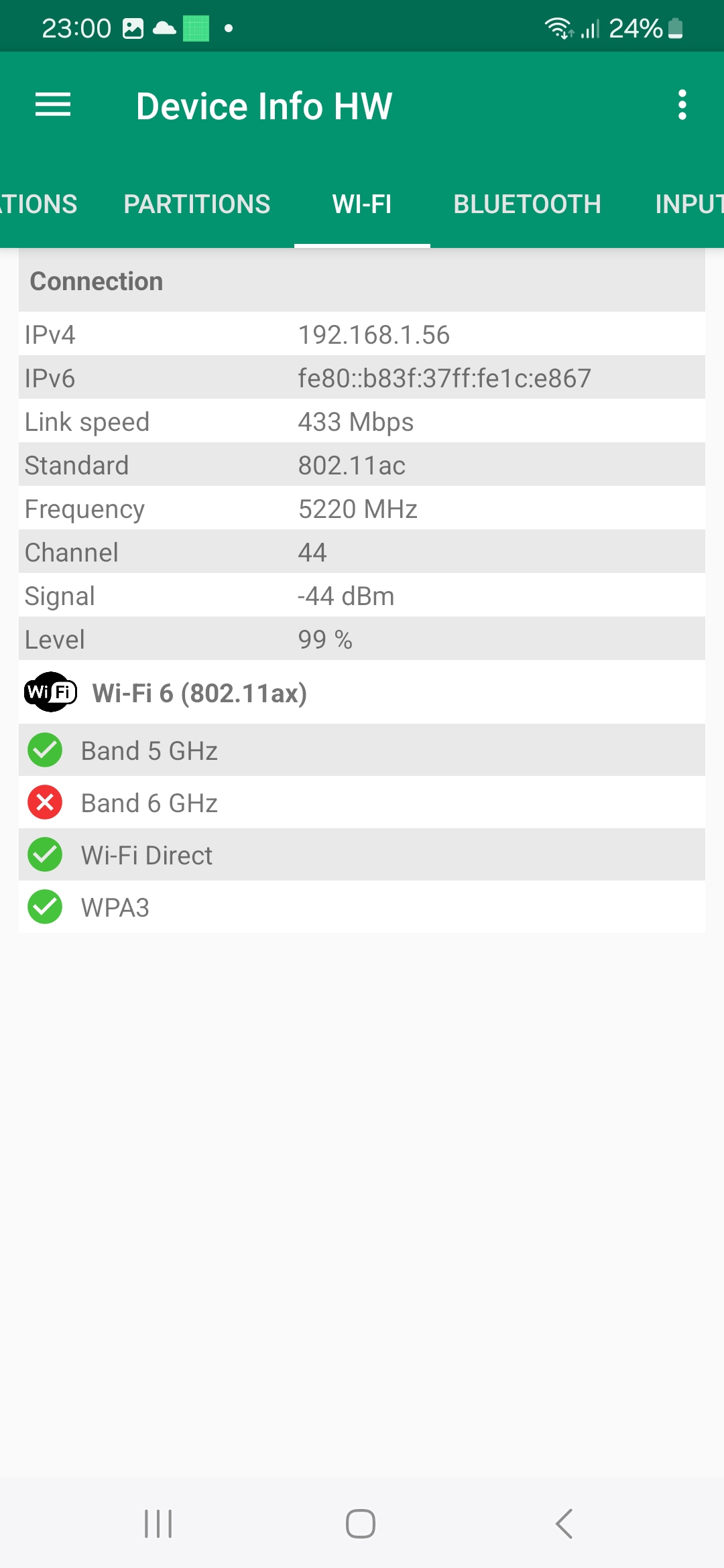 Pour tester la capacité d'un téléphone à bien capter le réseau j'effectue des mesures à proximité de mon routeur et ensuite à distance (et toujours dans les mêmes conditions). J'obtiens ainsi une moyenne en dBm où une valeur de -90 dBm indique une moins bonne performance qu'une valeur à -30 dBm.Signal Wifi: