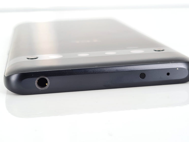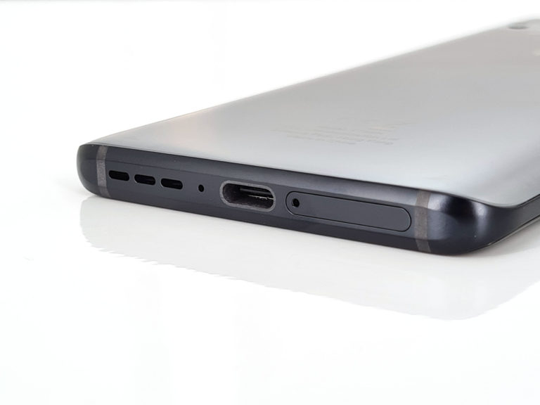 En dessous du téléphone on retrouve le port USB type C, le tiroir SIM (deux cartes sim ou une carte sim + carte mémoire) et le seul haut-parleur externe du téléphone. Le TCL 10 Pro ne pourra donc pas produire de son stéréo sans le casque.