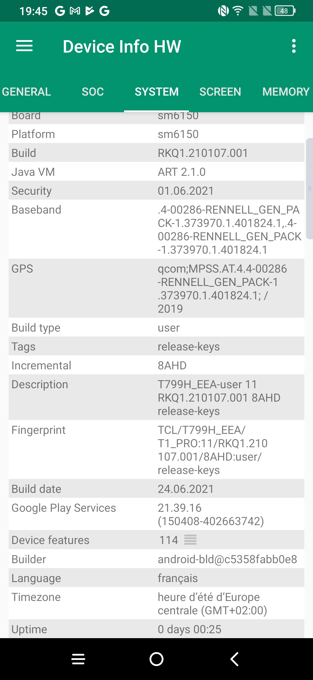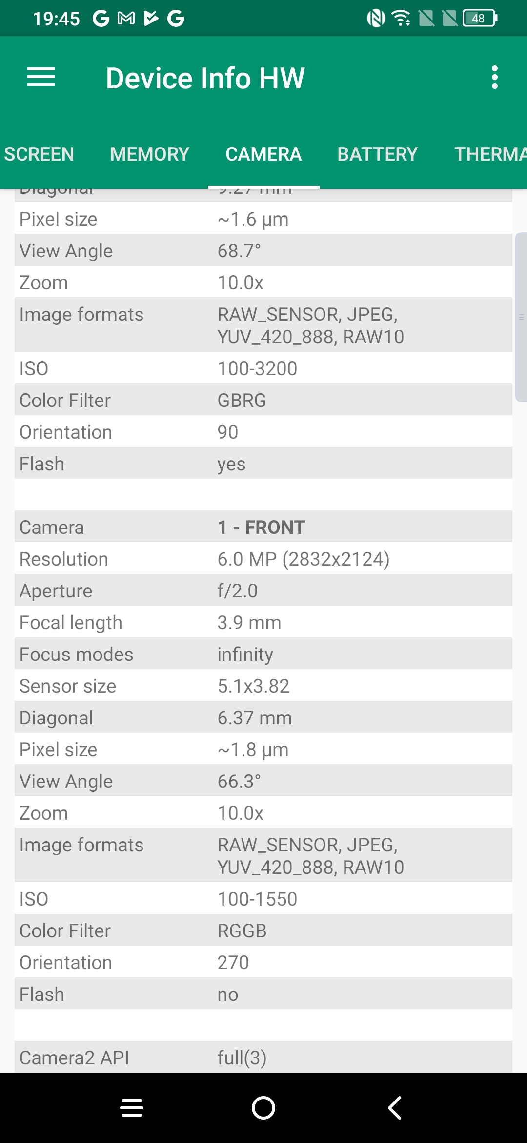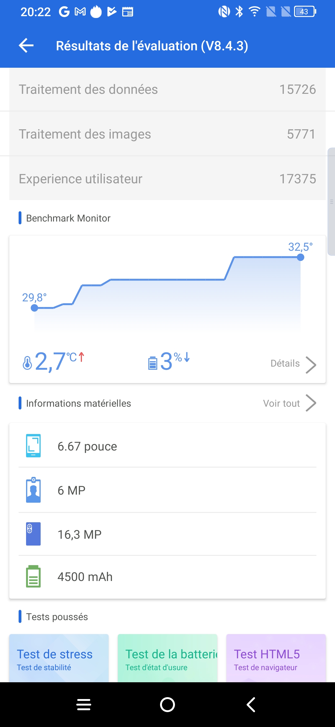 Les informations ci-dessous proviennent de l'application Device Info HW. L'application fournit des informations techniques détaillées sur le téléphone testé.J'ai testé la version 6Gb avec 128 Go et vous retrouverez toutes les caractéristiques techniques détaillées de ce téléphone sur les captures d'écran ci-dessous.
