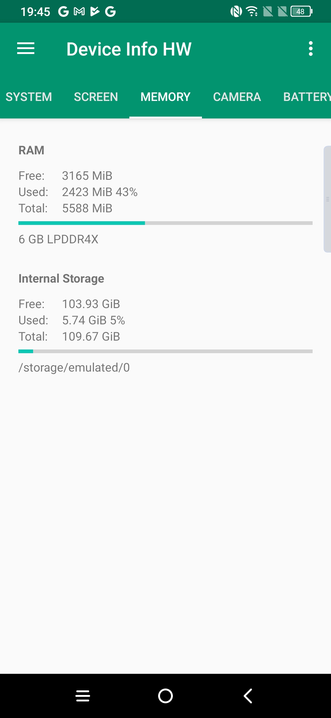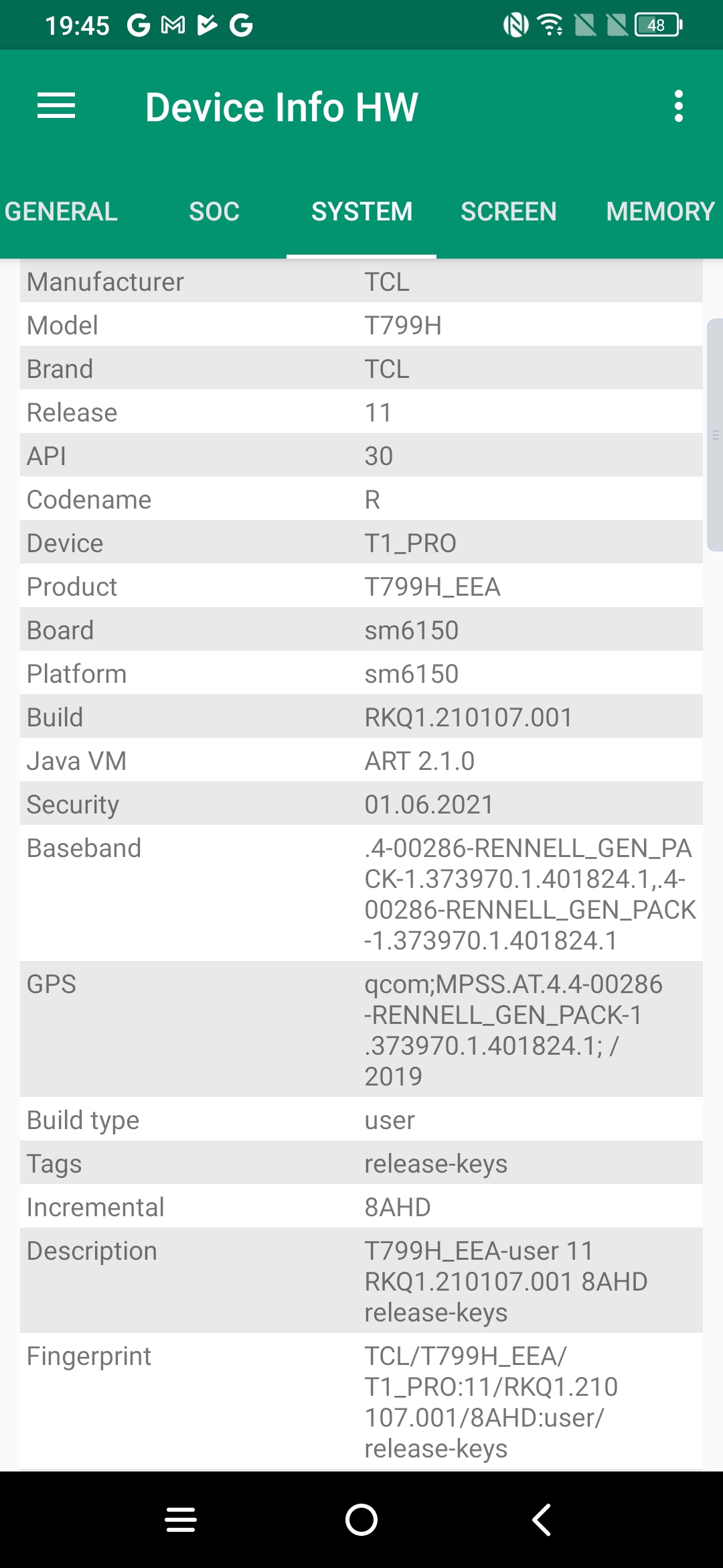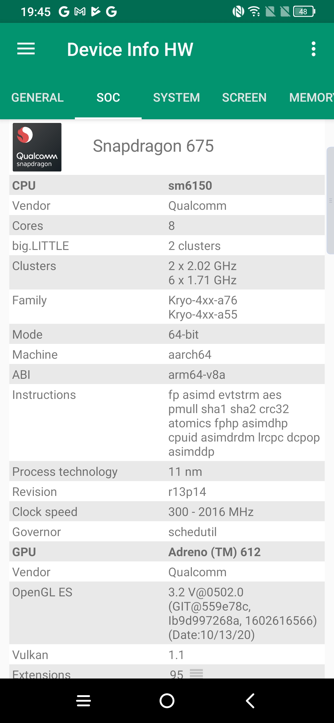 Les informations ci-dessous proviennent de l'application Device Info HW. L'application fournit des informations techniques détaillées sur le téléphone testé.J'ai testé la version 6Gb avec 128 Go et vous retrouverez toutes les caractéristiques techniques détaillées de ce téléphone sur les captures d'écran ci-dessous.