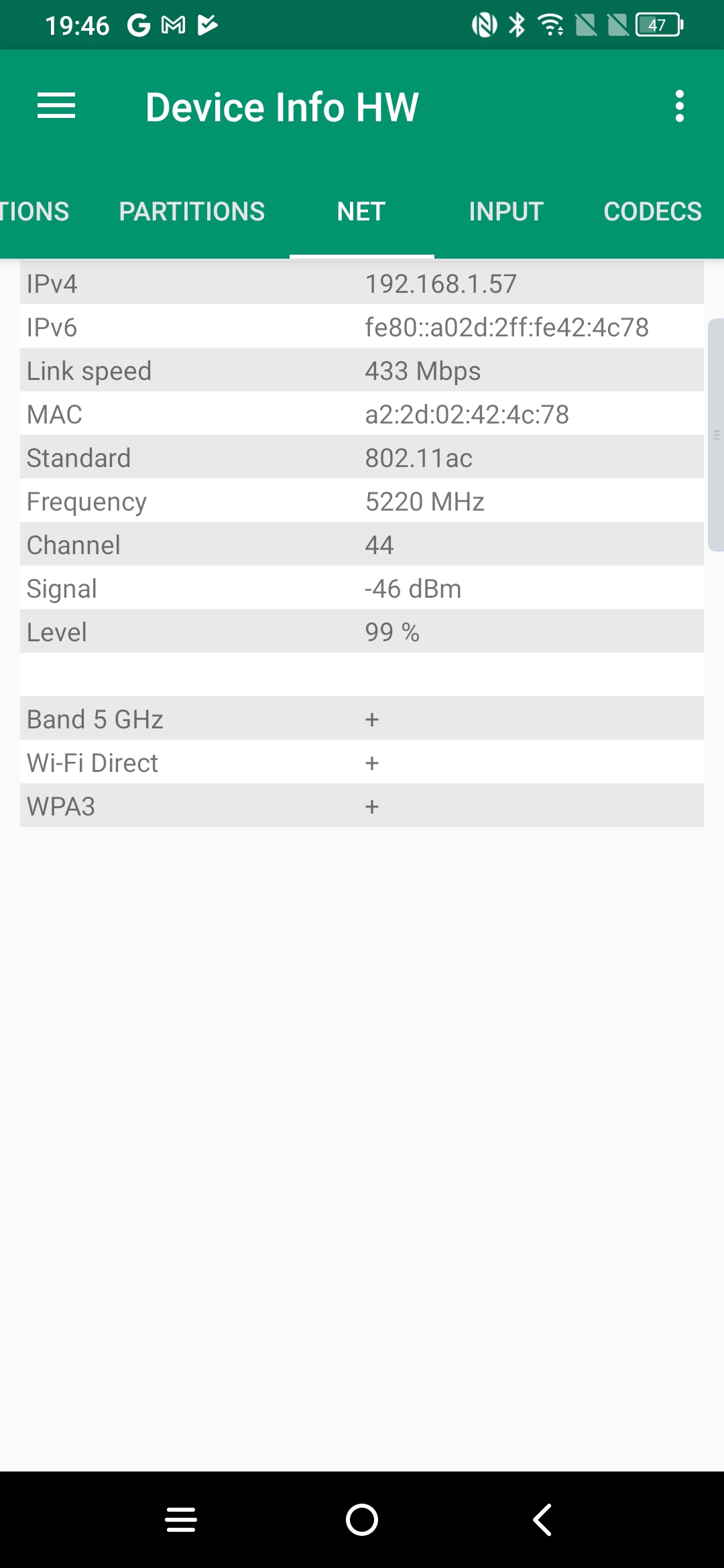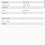 Pour tester la capacité d'un téléphone à bien capter le réseau j'effectue des mesures à proximité de mon routeur et ensuite à distance (et toujours dans les mêmes conditions). J'obtiens ainsi une moyenne en dBm où une valeur de -90 dBm indique une moins bonne performance qu'une valeur à -30 dBm.Signal Wifi: