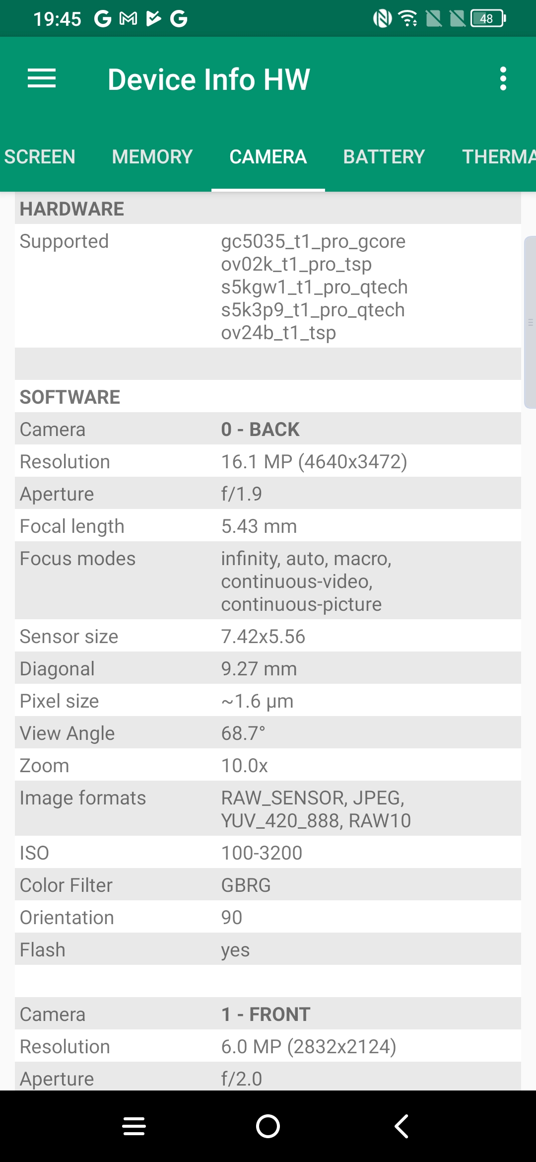 - Pas d'infos sur les capteurs alors que je sais qu'il s'agit d'un Samsung GW1