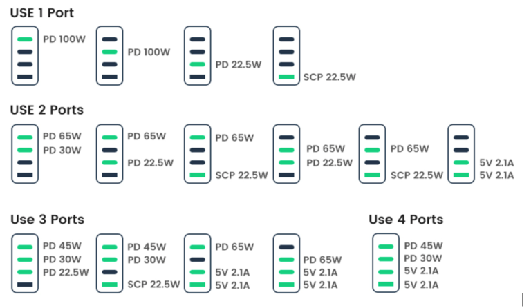 Le chargeur rapide UGREEN 100W GaN dispose de 4 ports USB qui délivrent une puissance différente et cette même puissance peut encore évoluer en fonction du nombre d'appareils connectés simultanément.