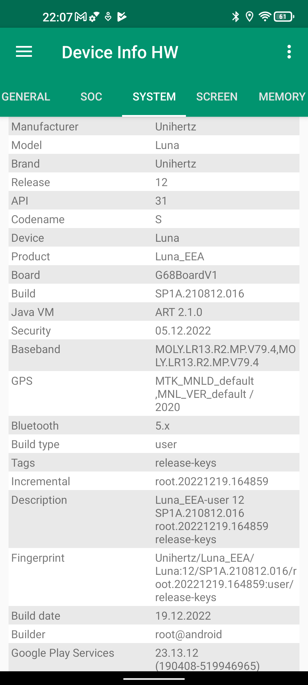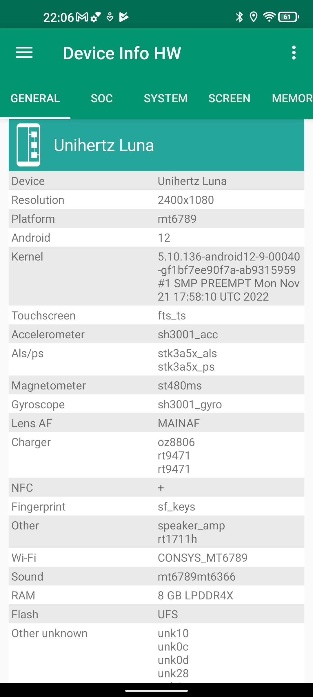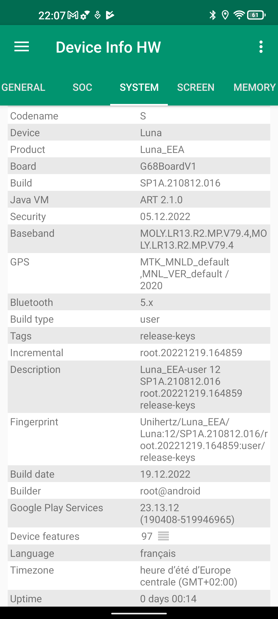 Les informations ci-dessous proviennent de l'application Device Info HW. L'application fournit des informations techniques détaillées sur le téléphone testé.Le Unihertz Luna utilise la même architecture Mediatek que le Unihertz Tank. Le modèle que j’ai testé dispose de 8 Gb de mémoire RAM et 256 Gb de mémoire de stockage.