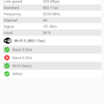 Pour tester la capacité d'un téléphone à bien capter le réseau j'effectue des mesures à proximité de mon routeur et ensuite à distance (et toujours dans les mêmes conditions). J'obtiens ainsi une moyenne en dBm où une valeur de -90 dBm indique une moins bonne performance qu'une valeur à -30 dBm.Signal Wifi: