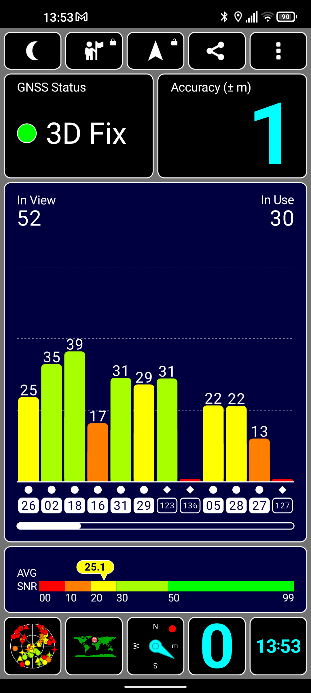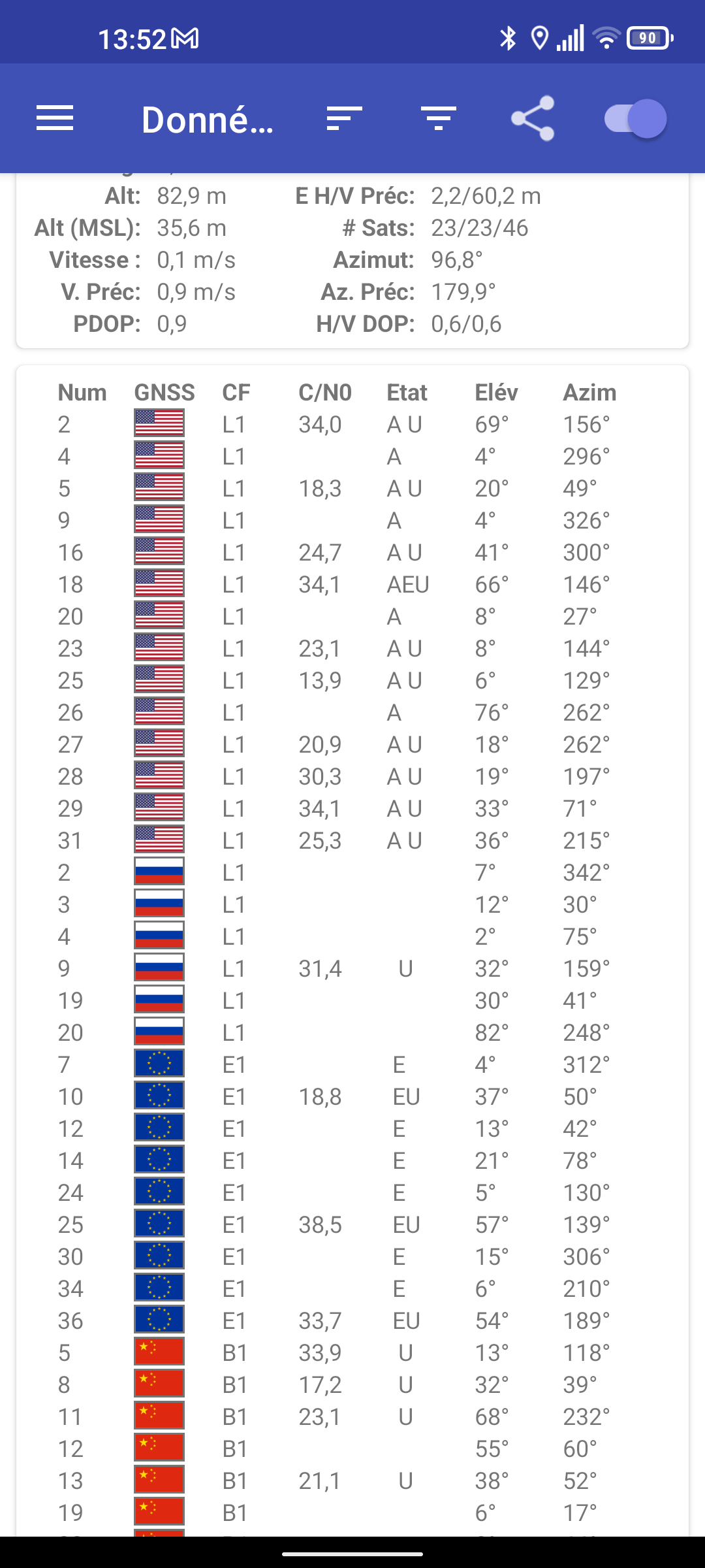 J'ai obtenu un niveau de précision GPS à 1 mètre avec ce téléphone avec une trentaine de satellites disponibles, c'est souvent le cas avec les puces GPS de chez Mediatek. J'ai ensuite vérifié les fréquences utilisées et je n'ai vu qu'une seule fréquence par réseau. J'ai également vérifié ma position par rapport à la réalité et je me trouvais effectivement à environ 1 mètre de la position indiquée sur la carte. Ce téléphone a donc un bon niveau de précision GPS.