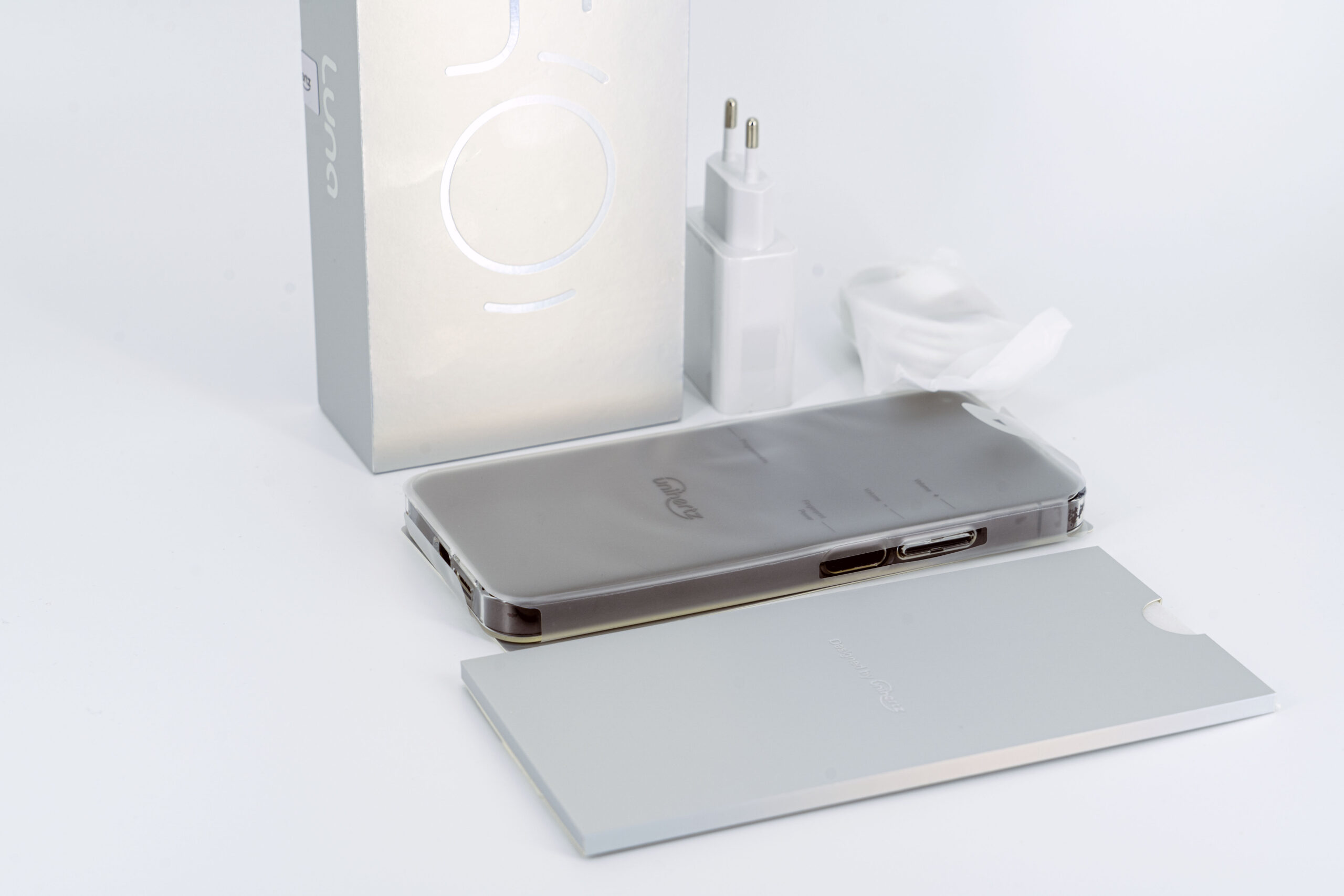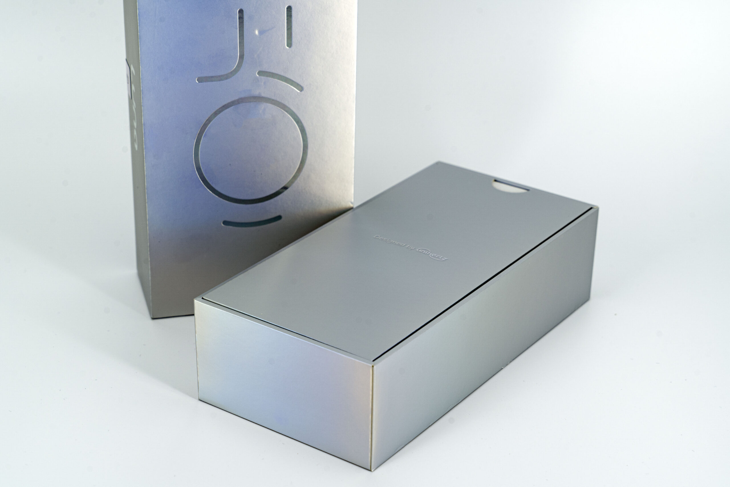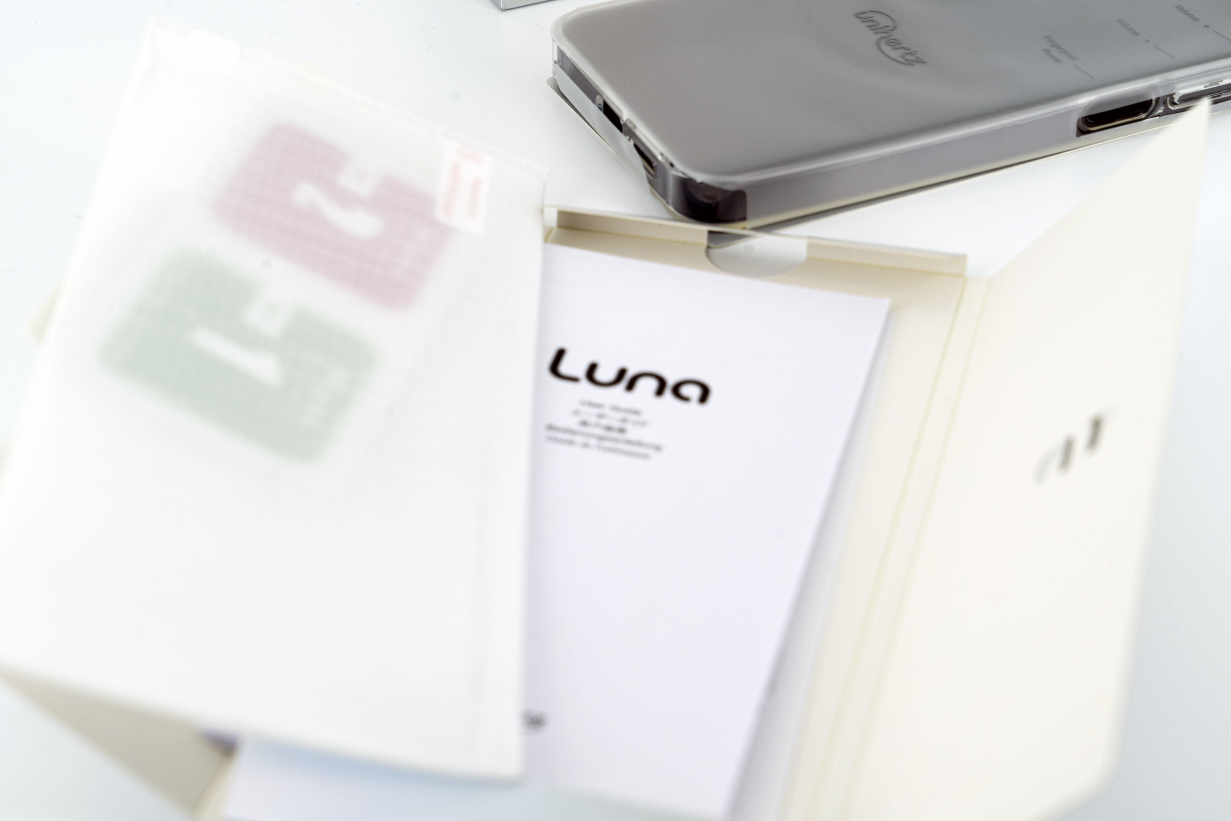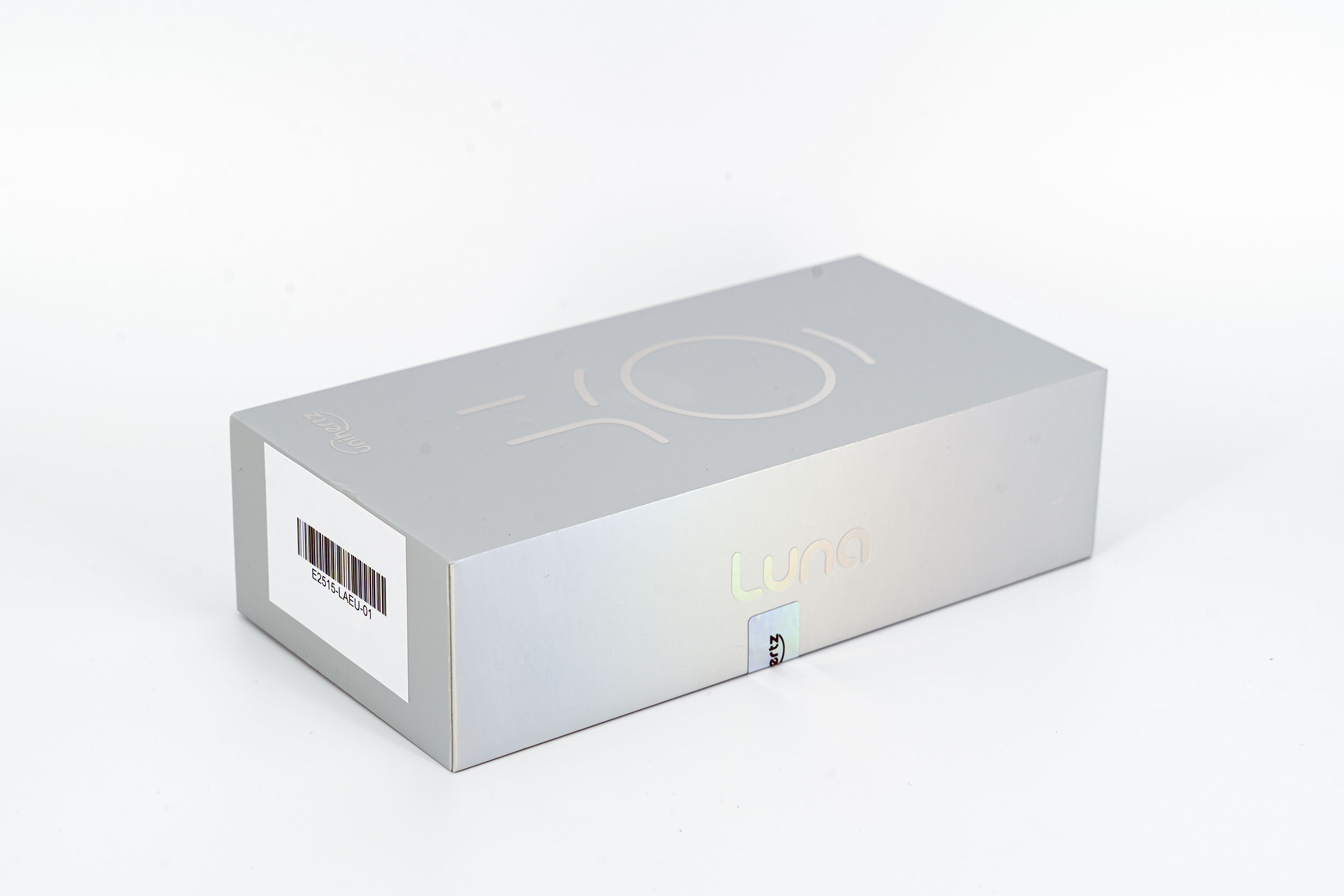 Le Luna marque un point avec l’emballage. La boite est grise avec des reflets métalliques un peu comme un hologramme et ce choix de texture lui donne un effet premium assez réussi. Cette impression ne s’évapore pas à l’ouverture de la boite car le contenu suit la même ligne conductrice.