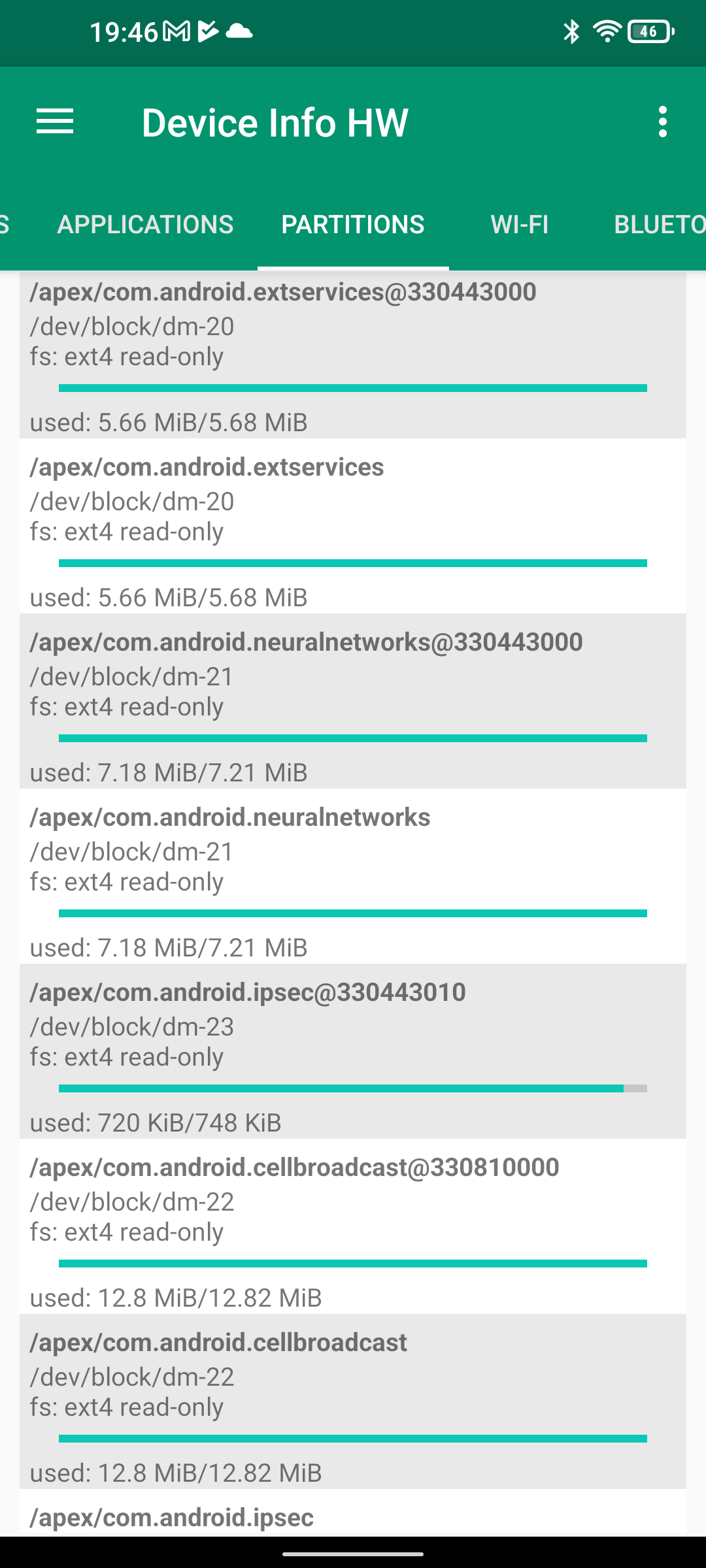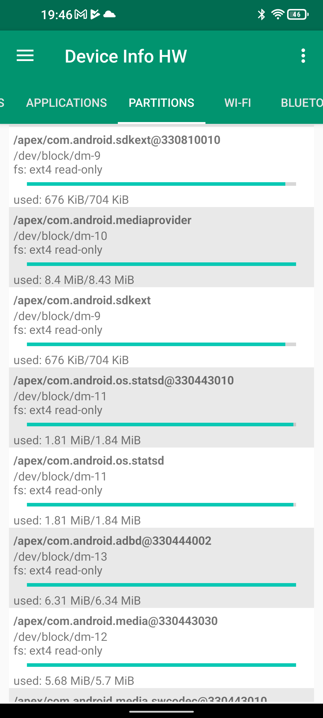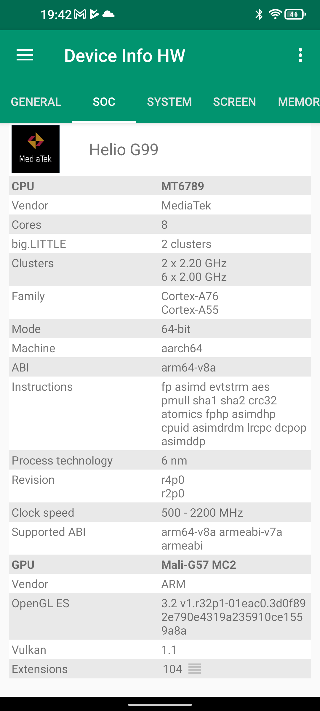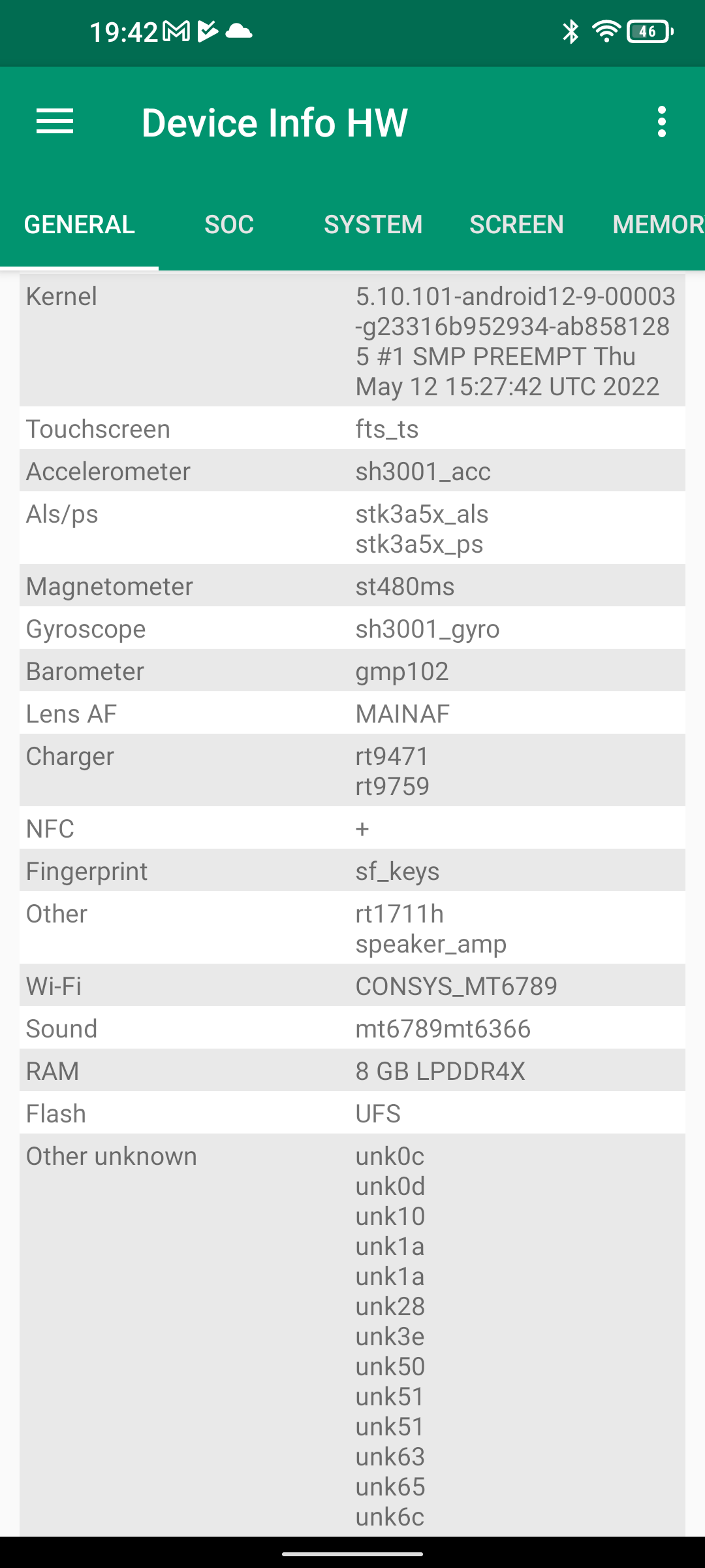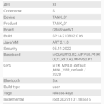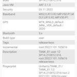 Les informations ci-dessous proviennent de l'application Device Info HW. L'application fournit des informations techniques détaillées sur le téléphone testé.Le Unihertz Tank tourne sur la même architecture que le Poco M5 mais je reviens sur ce point dans un des paragraphes suivants. Je n'avais pas reçu une fiche technique détaillée avec le téléphone, j'ai donc du fouiller un peu dans ses caractéristiques techniques pour comprendre de quoi il était composé. Le fait qu'il tourne sur la même architecture que le POCO implique qu'il partage les composants suivants: CPU, GPU, modem, puce wifi, puce gps,... A priori d'un point de vue technique il devrait donc avoir des performances assez similaires au POCO sauf que son énorme armure pourrait jouer un rôle dans la sensibilité au réseau mais ce point sera testé plus loin dans ce test également.
