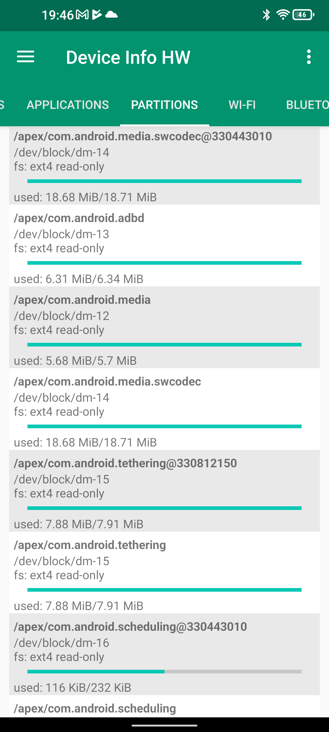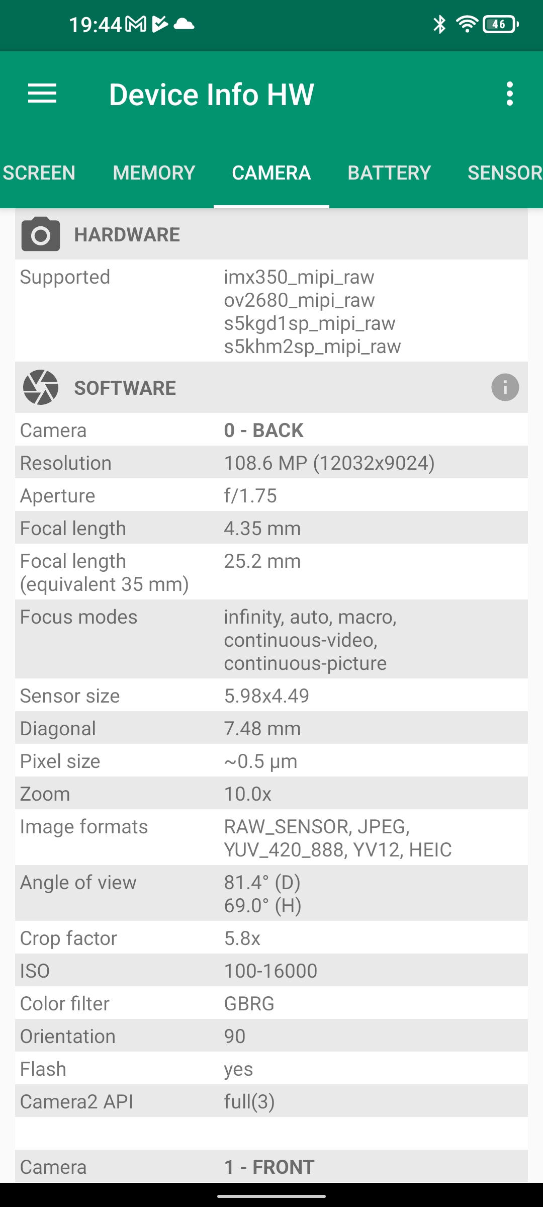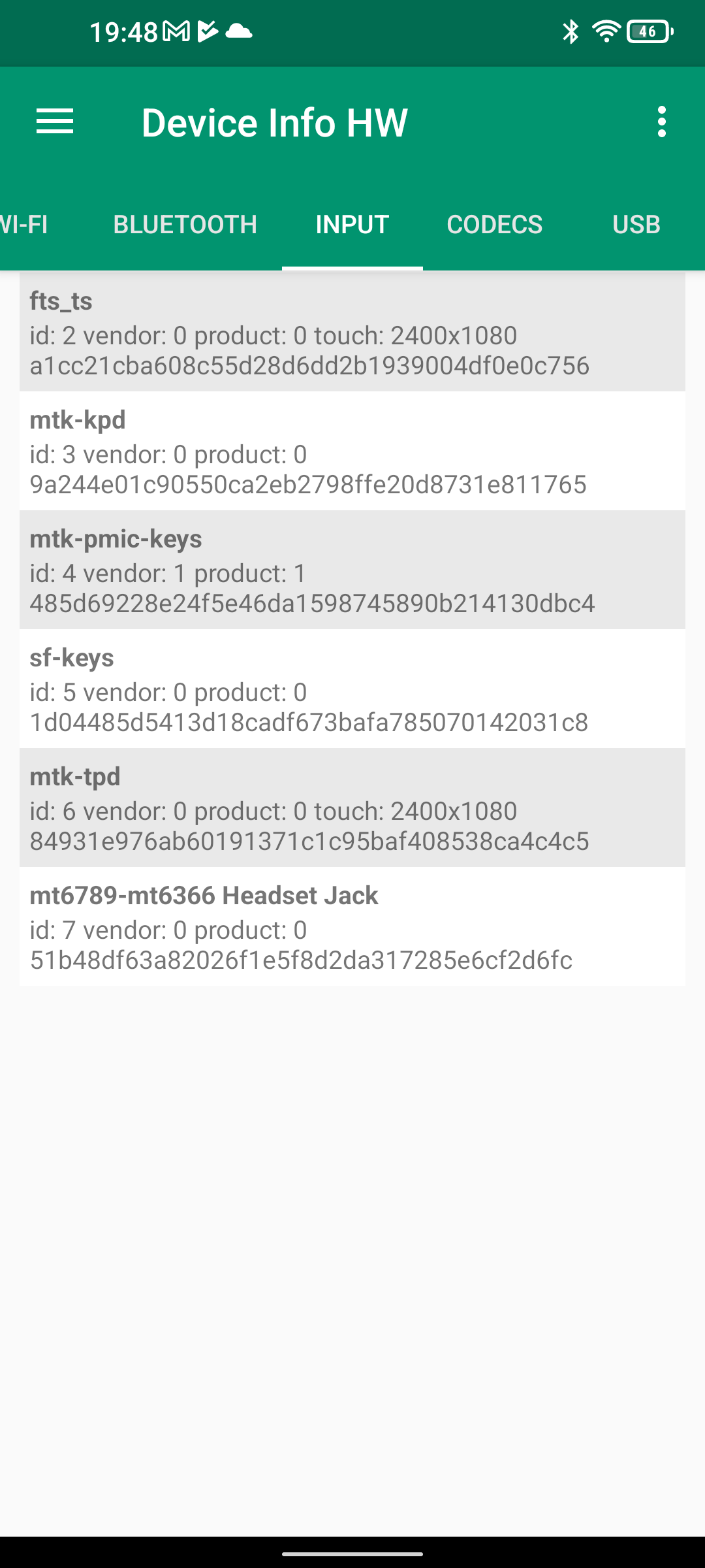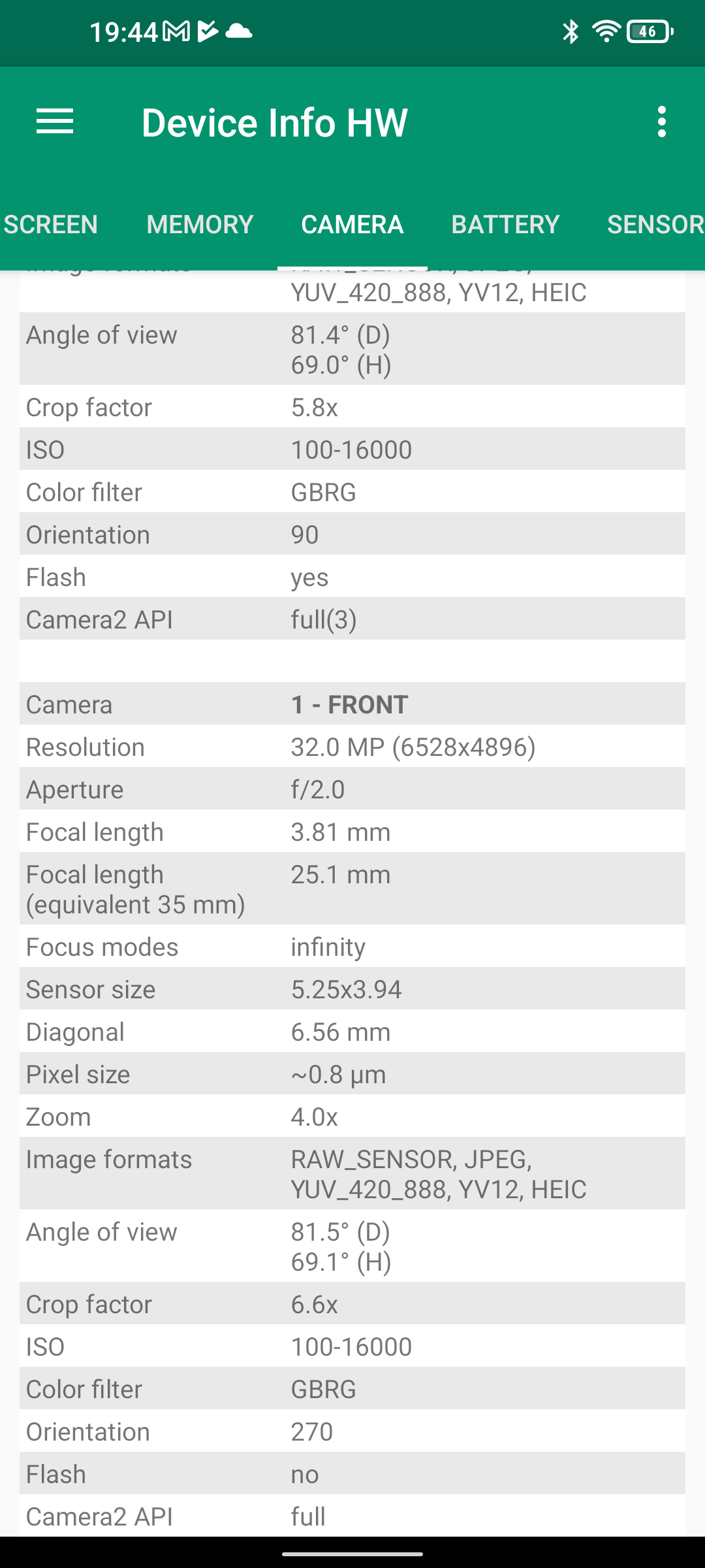 Les informations ci-dessous proviennent de l'application Device Info HW. L'application fournit des informations techniques détaillées sur le téléphone testé.Le Unihertz Tank tourne sur la même architecture que le Poco M5 mais je reviens sur ce point dans un des paragraphes suivants. Je n'avais pas reçu une fiche technique détaillée avec le téléphone, j'ai donc du fouiller un peu dans ses caractéristiques techniques pour comprendre de quoi il était composé. Le fait qu'il tourne sur la même architecture que le POCO implique qu'il partage les composants suivants: CPU, GPU, modem, puce wifi, puce gps,... A priori d'un point de vue technique il devrait donc avoir des performances assez similaires au POCO sauf que son énorme armure pourrait jouer un rôle dans la sensibilité au réseau mais ce point sera testé plus loin dans ce test également.