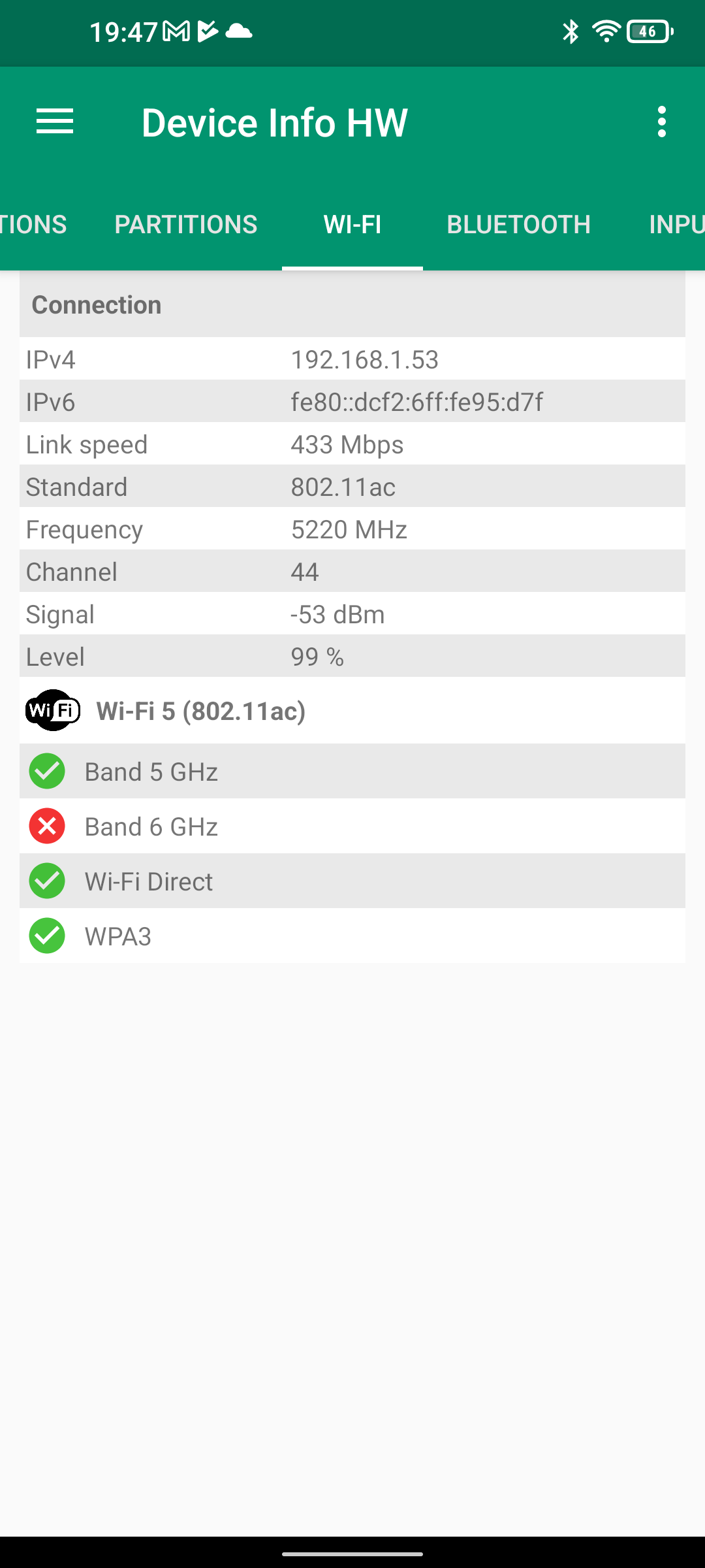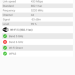 Pour tester la capacité d'un téléphone à bien capter le réseau j'effectue des mesures à proximité de mon routeur et ensuite à distance (et toujours dans les mêmes conditions). J'obtiens ainsi une moyenne en dBm où une valeur de -90 dBm indique une moins bonne performance qu'une valeur à -30 dBm.Signal Wifi: