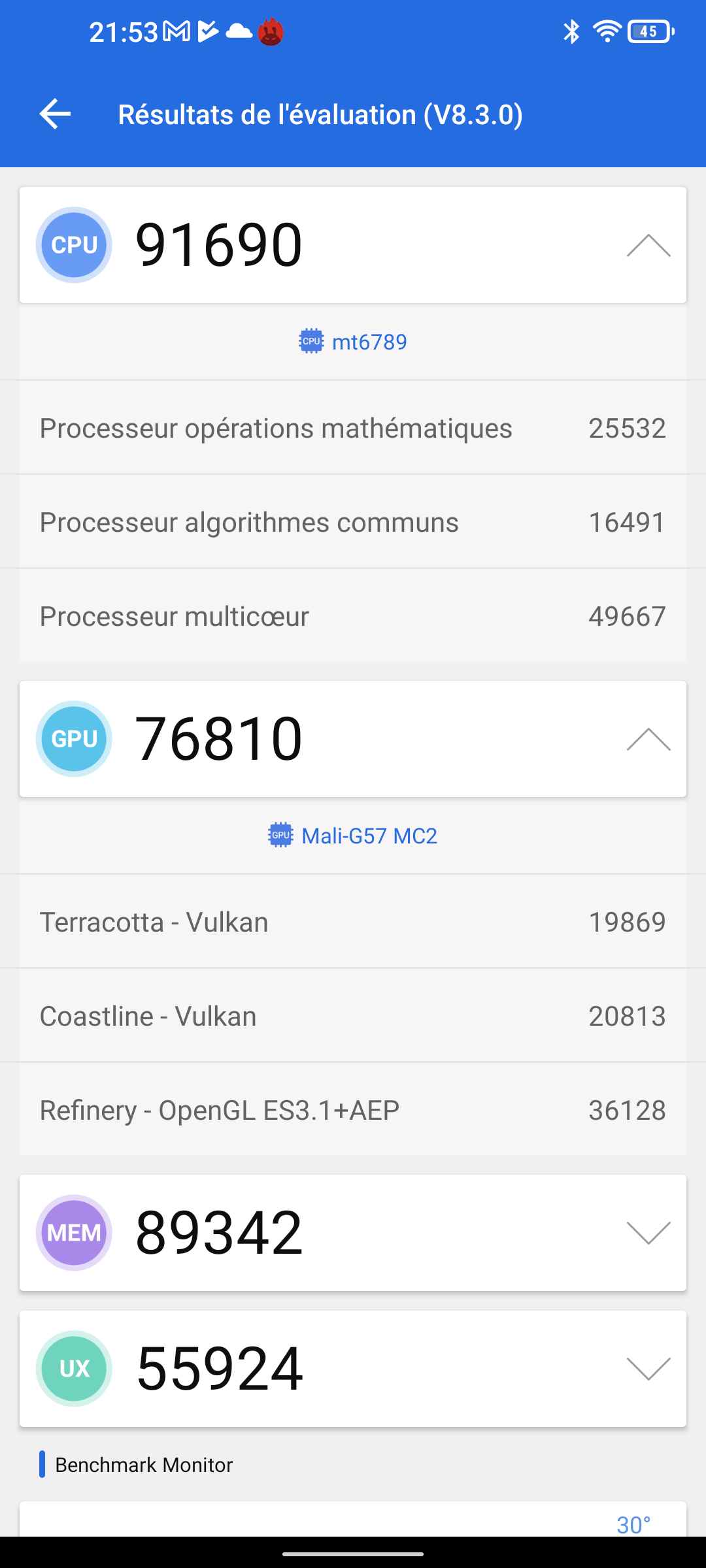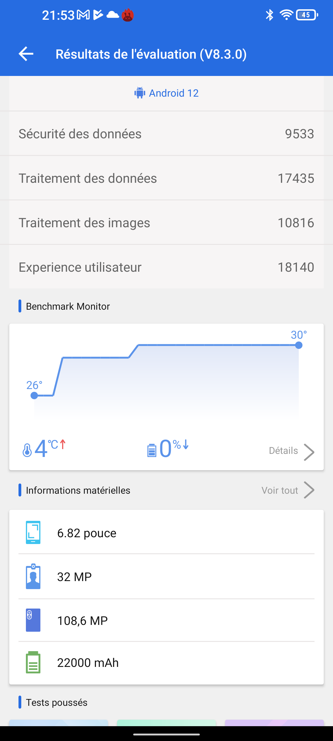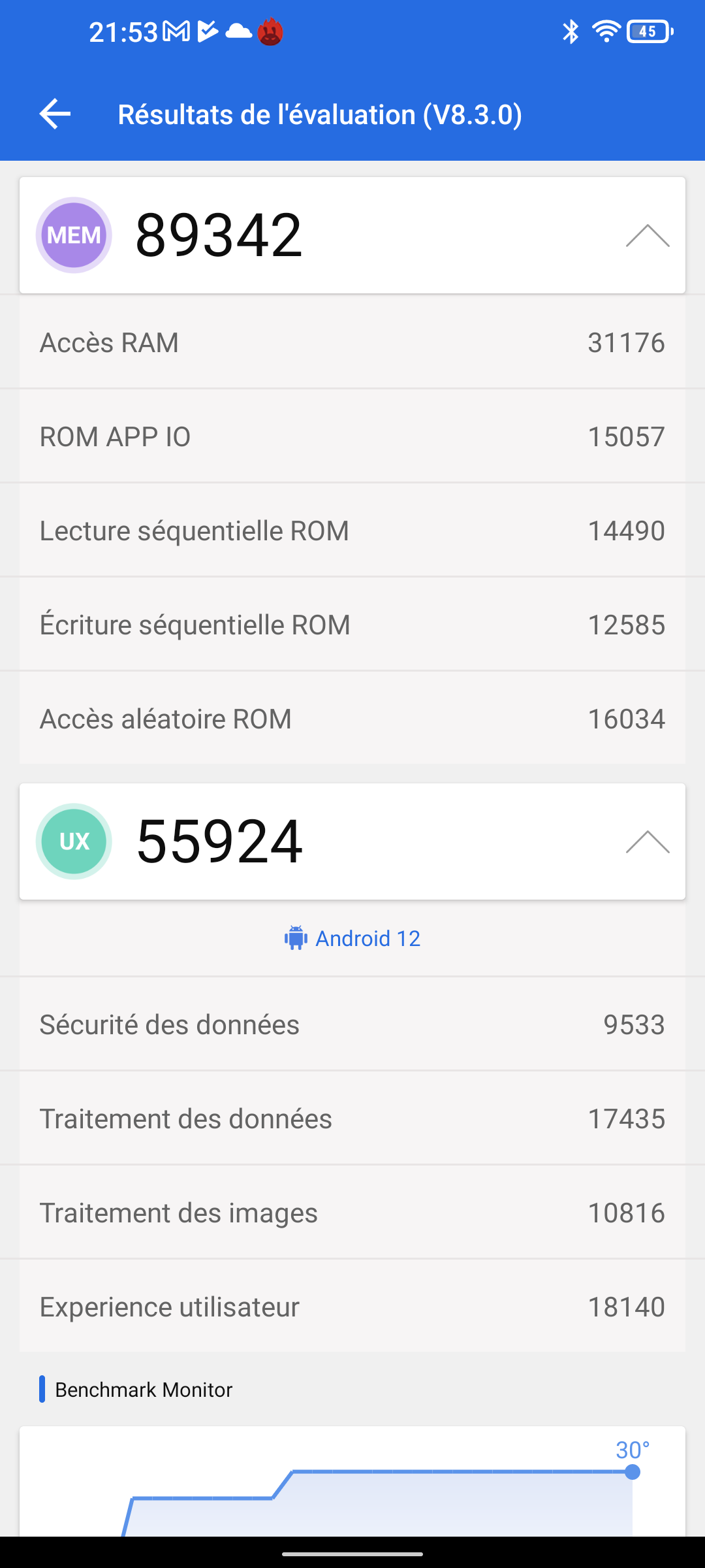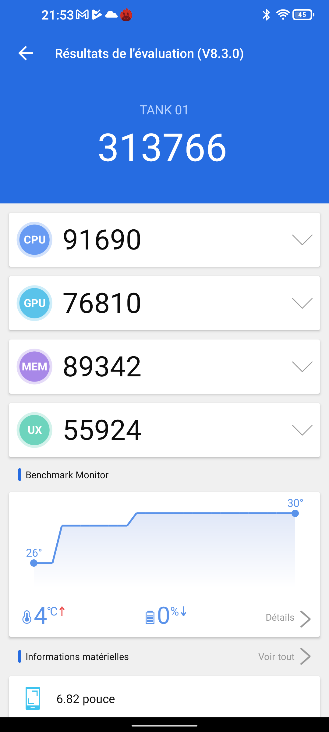 J'ai obtenu un score de 313766 points avec Antutu, c'est 16% de mieux que le POCO M5 qui utilise pourtant le même matériel. Cette différence provient d'une meilleure performance du GPU et de la mémoire. A priori ce téléphone n'est pas conçu pour les gamers mais avec un telle performance il pourra faire tourner la plupart des jeux dans de bonnes conditions et avec une telle batterie vous pourrez jouer bien plus longtemps qu'avec un POCO M5. L'autre avantage qui pourrait intéresser les gamers c'est que la température n'est pas montée pendant le benchmark avec Antutu, même pas un degré!Performance énergétique
