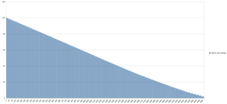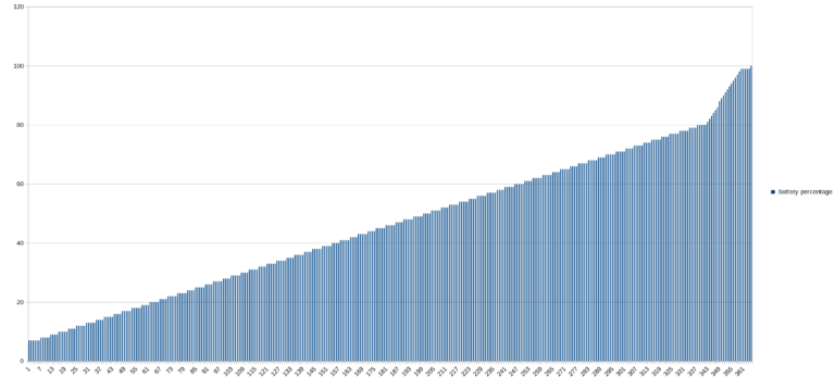 Pour tester l'autonomie des batteries j'ai développé une application qui mesure le niveau de batterie minute par minute jusqu'à ce que la batterie soit vide. Cette application consomme environ une dizaine de pourcent des ressources du téléphone et je fais un test avec une luminosité d'écran à 100% et un autre avec une luminosité à 50%. Ce test vise à reproduire une utilisation contemplative d'un téléphone (ex: surfer sur internet, lire des articles, passer du temps sur les réseaux sociaux). Ces résultats ne sont pas valables pour une utilisation intensive type gaming/streaming. [battery] Le Unihertz Tank est de loin le téléphone avec la plus grosse batterie parmi tous ceux que j'ai testés et avec une batterie de cette taille, je m'attendais à 2 choses: un temps de chargement très long et une autonomie incroyable. Je me suis trompé sur les deux points. Il y a d'abord le temps de charge qui est assez rapide pour une batterie de cette taille mais à condition d'utiliser un chargeur rapide. Avec mon UGREEN 100W, j'ai chargé la batterie de 3 à 100% en 188 minutes. Cela fait quand même 3 heures mais avec une telle taille de batterie c'est une excellente performance. La charge est assez linéaire même si le graphique ci-dessous présente une anomalie, mon application de mesure a perdu des unités de temps à un moment donné ce qui a donné l'impression que la charge était plus rapide à la fin. Ce n'est pas le cas, j'ai mesuré les unités de temps à la main pour obtenir 188 minutes.