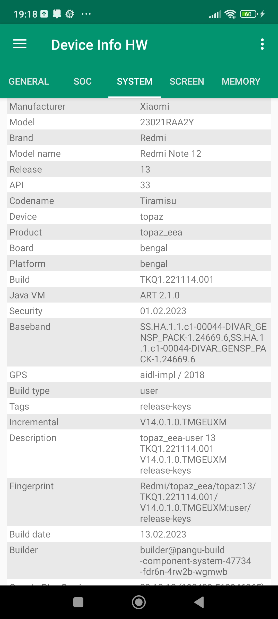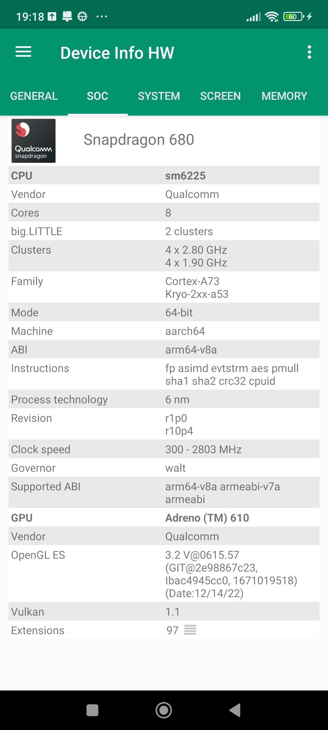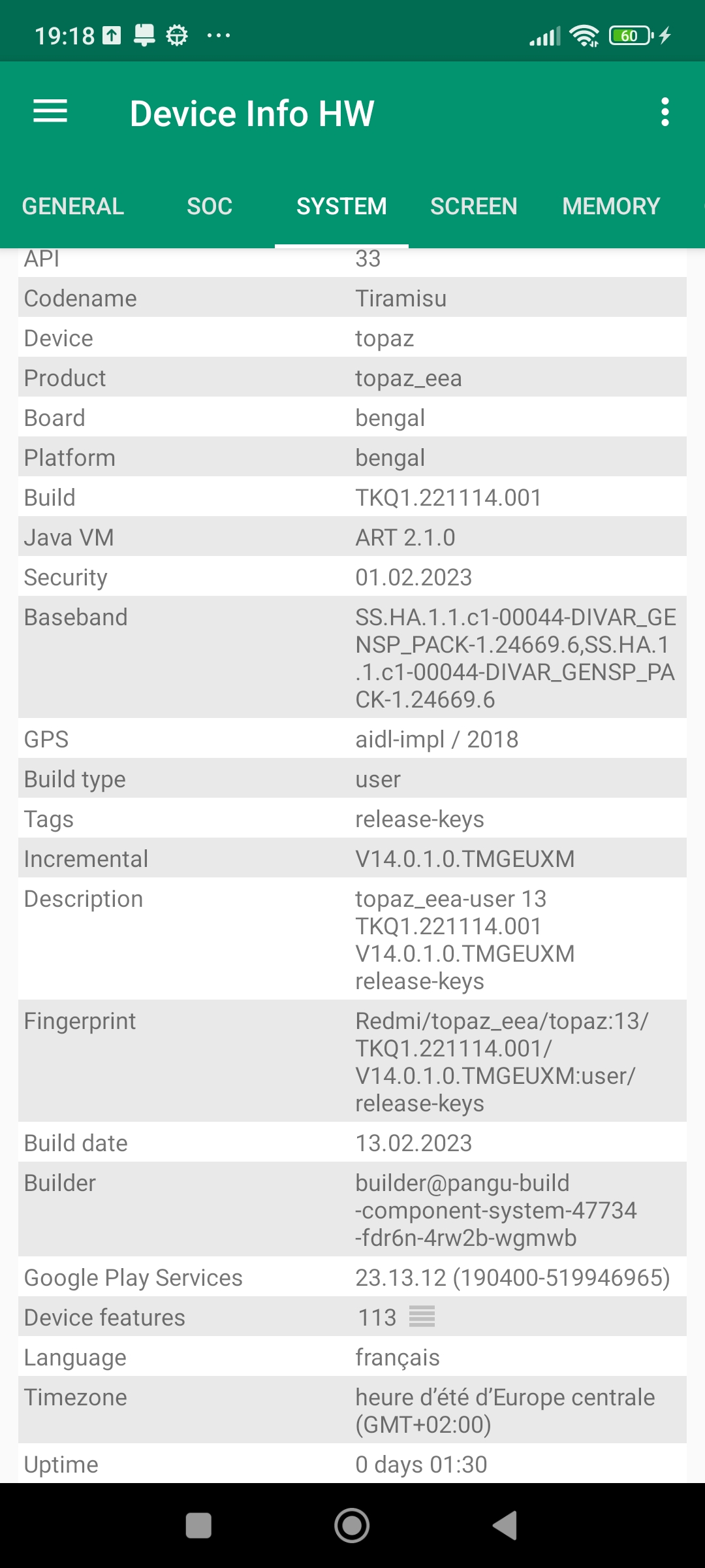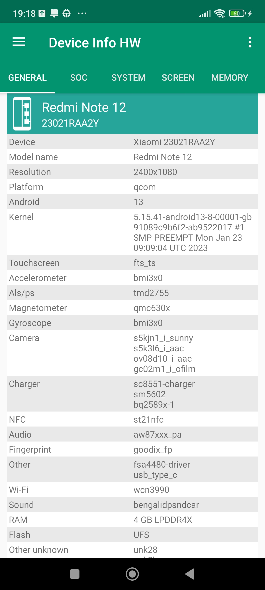 Les informations ci-dessous proviennent de l'application Device Info HW. L'application fournit des informations techniques détaillées sur le téléphone testé.Je parlais de sauts de générations en début de ce test car j’ai remarqué que Xiaomi apportent des nouveautés une fois sur deux et en principe, ce Redmi Note 12 devait apporter quelques nouveautés…ce n’est pas le cas, vraiment pas, je trouve ça même assez énervant de retrouver exactement le même matériel d’une génération à l’autre. Il existe une version 5G qui est un peu différente mais la version 4G c’est juste un Redmi Note 11 dans un autre emballage.