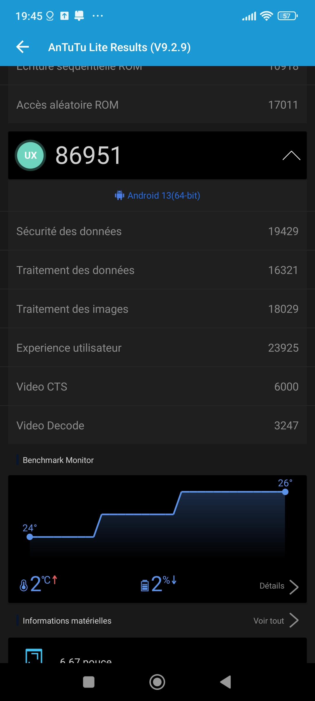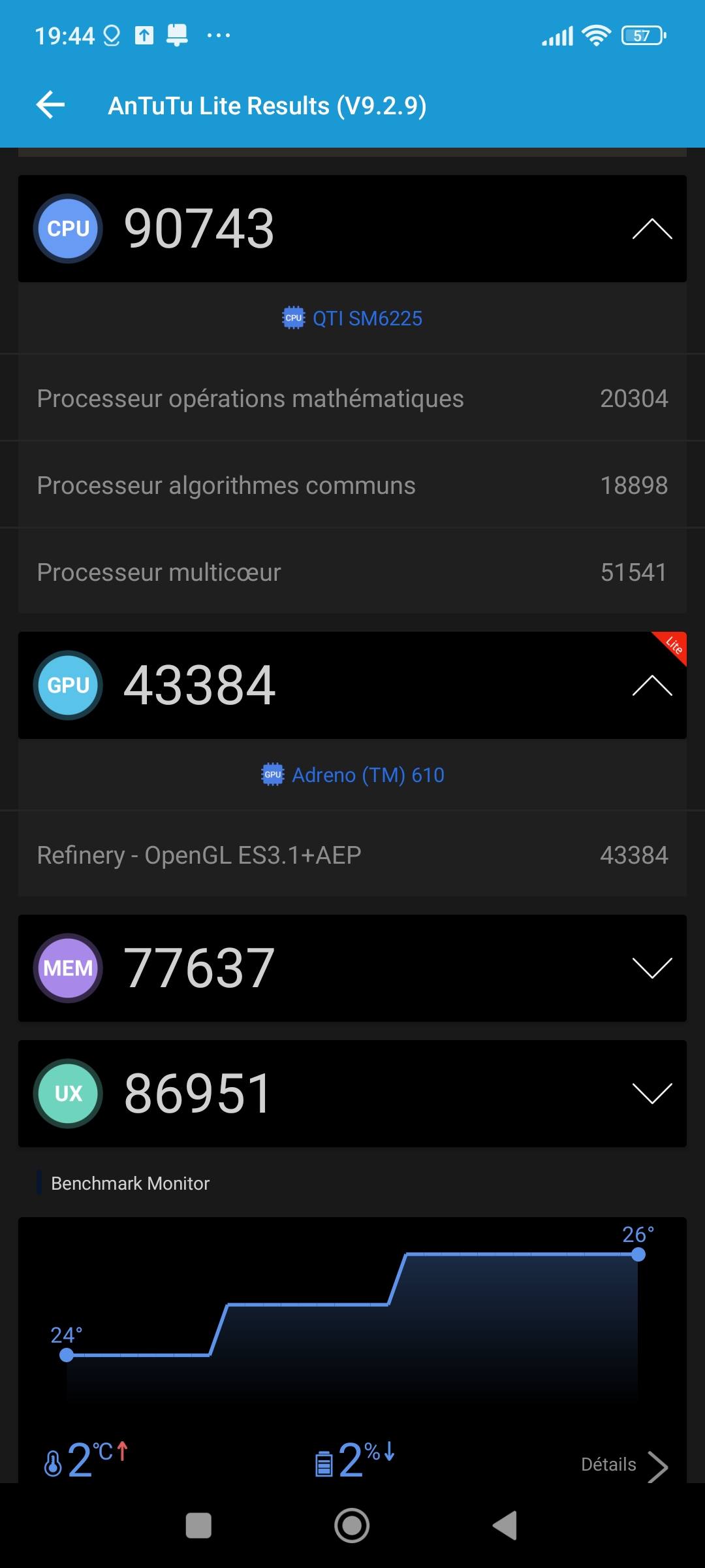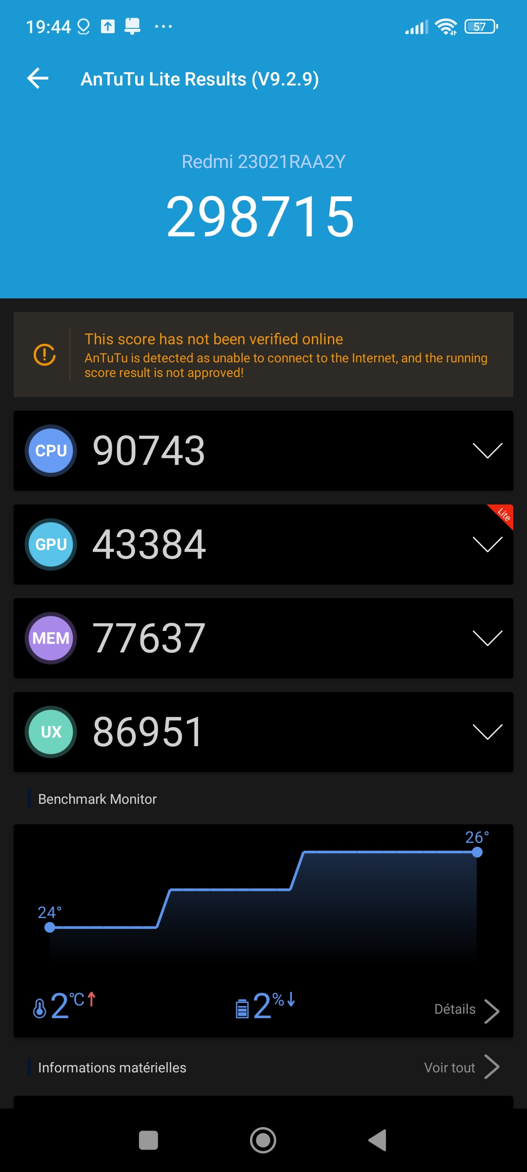 J'ai obtenu un score de 298715 points avec Antutu v9, je n'ai pas réussi à faire tourner Antutu v8 sur ce téléphone. J'avais obtenu un score de 233020 points avec le Redmi Note 11 alors qu'il utilise le même matériel. Pourquoi cette différence? Je vois deux raisons. La première c'est que Antutu v9 a tendance à aboutir sur des scores plus élevés. La deuxième c'est ce que j'expliquais dans le paragraphe précédent, le Redmi Note 12 a une fréquence d'horloge plus élevée.Ce genre de performance permet de jouer à la plupart des jeux mais avec une diminution du niveau de graphisme. Je sens aussi parfois quelques lenteurs en dehors des jeux mais comme je teste d'autres téléphones plus performants en même temps, ça saute plus vite aux yeux. Je ne suis pas sûr qu'un utilisateur normal se rendra compte par exemple que le clavier met une seconde de plus à s'afficher.