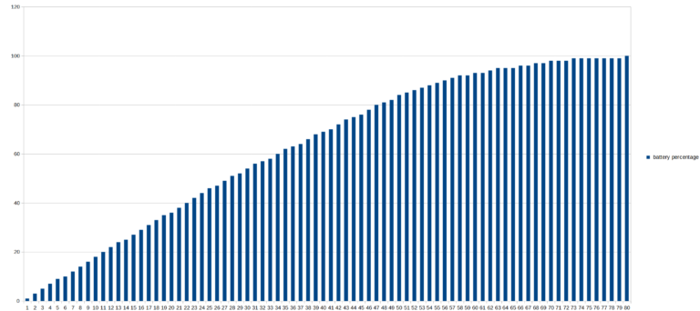J'ai utilisé mon chargeur UGREEN 100W pour tester la vitesse de charge de ce téléphone et il m'a fallu presque 1h30 pour charger ce téléphone de 0 à 100%. Comme vous pouvez le constater sur ce graphique, la charge est loin d'être linéaire. La vitesse de charge diminue fortement sur les 20 derniers pourcents. Il faut 50 minutes pour atteindre 80% et presque 40 minutes pour les 20 derniers pourcents.