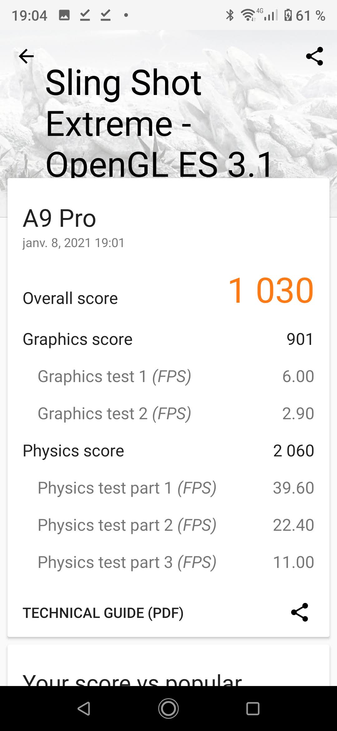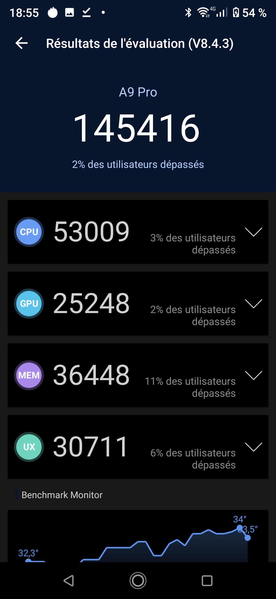 Le Umidigi A9 Pro est un téléphone d'entrée de gamme, il ne faut donc pas s'attendre à de grosses performances. J'ai obtenu un score de 145000 points avec Antutu. Ce score classe le Umidigi A9 Pro en dessous du Redmi Note 9. Ce n'est pas un problème en soi car la différence n'est pas gigantesque et le Umidigi est commercialisé à un prix inférieur, le rapport prix/performance est donc plutôt bon.Le Umidigi A9 Pro montre quelques ralentissements lorsque l'on passe d'un écran à l'autre ou au démarrage des applications mais de nouveau c'est parfaitement prévisible et tout à fait normal dans cette gamme de prix.