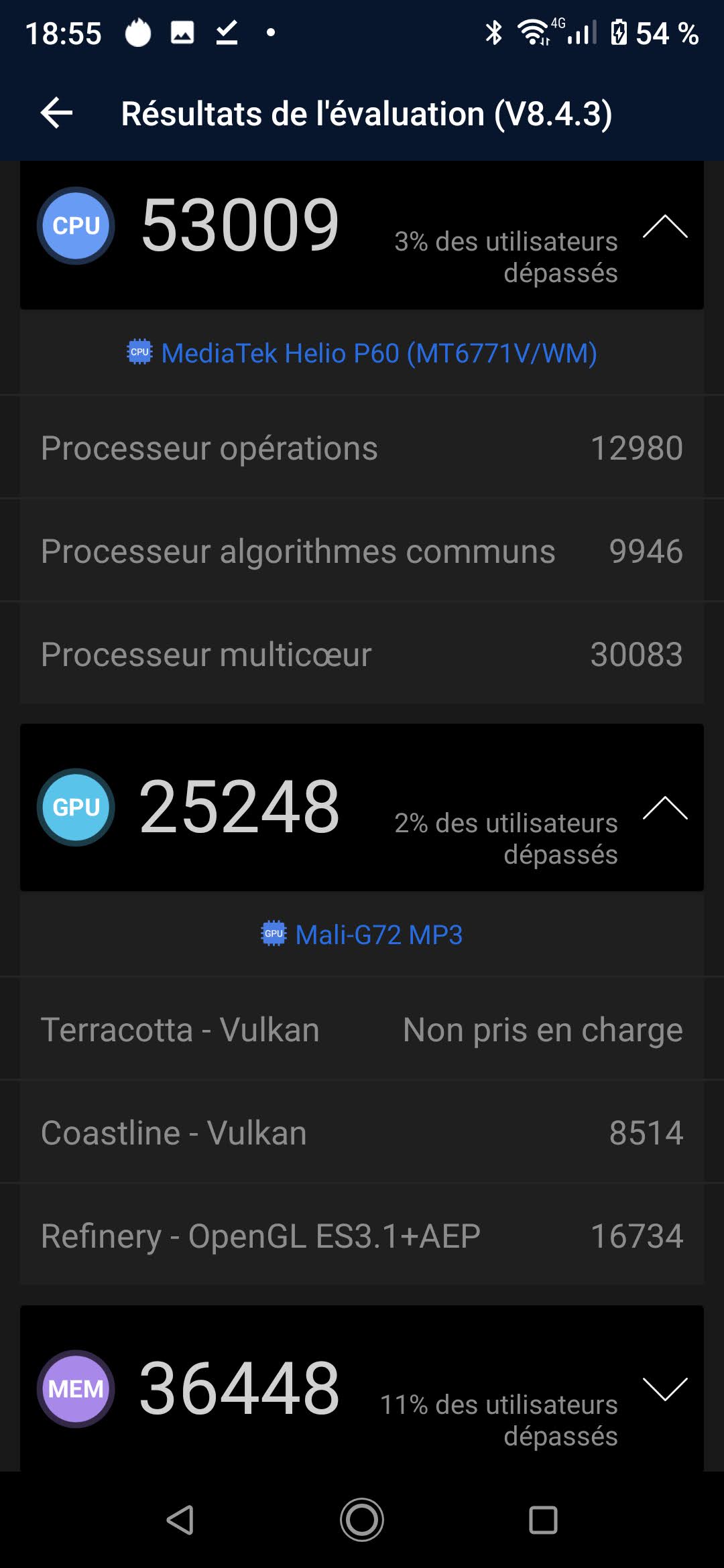 Le Umidigi A9 Pro est équipé d'un CPU MediaTek Helio P60, ce CPU existe depuis plus d'un an et il est couramment utilisé dans les téléphones d'entrée de gamme. Je l'ai retrouvé sur d'autres téléphones testés comme le Umidigi F1, le Umidigi Bison et le Oukitel C21. Il offre un niveau de performance un peu inférieur au Redmi Note 9.