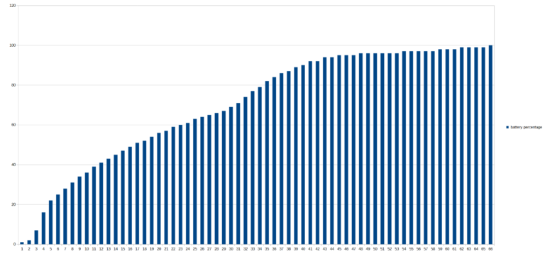 [battery] Umidigi commercialise souvent des téléphones avec une capacité de batterie supérieure à la moyenne, ce n'est pas le cas pour le Umidigi A9 Pro car la capacité est limité à 4150 mAh. Je ne peux pas considérer cela comme une faiblesse car beaucoup de téléphones sont commercialisés avec une batterie de capacité équivalent, c'est juste que Umidigi avait l'habitude d'utiliser des batteries d'une capacité plus importante.J'ai chargé la batterie de 1 à 100% en 112 minutes, c'est le téléphone le plus rapide que j'ai pu tester jusqu'à présent. La courbe de chargement est assez curieuse car le chargement est très rapide au début, elle fluctue un peu et puis s'aplatit longuement vers la fin.