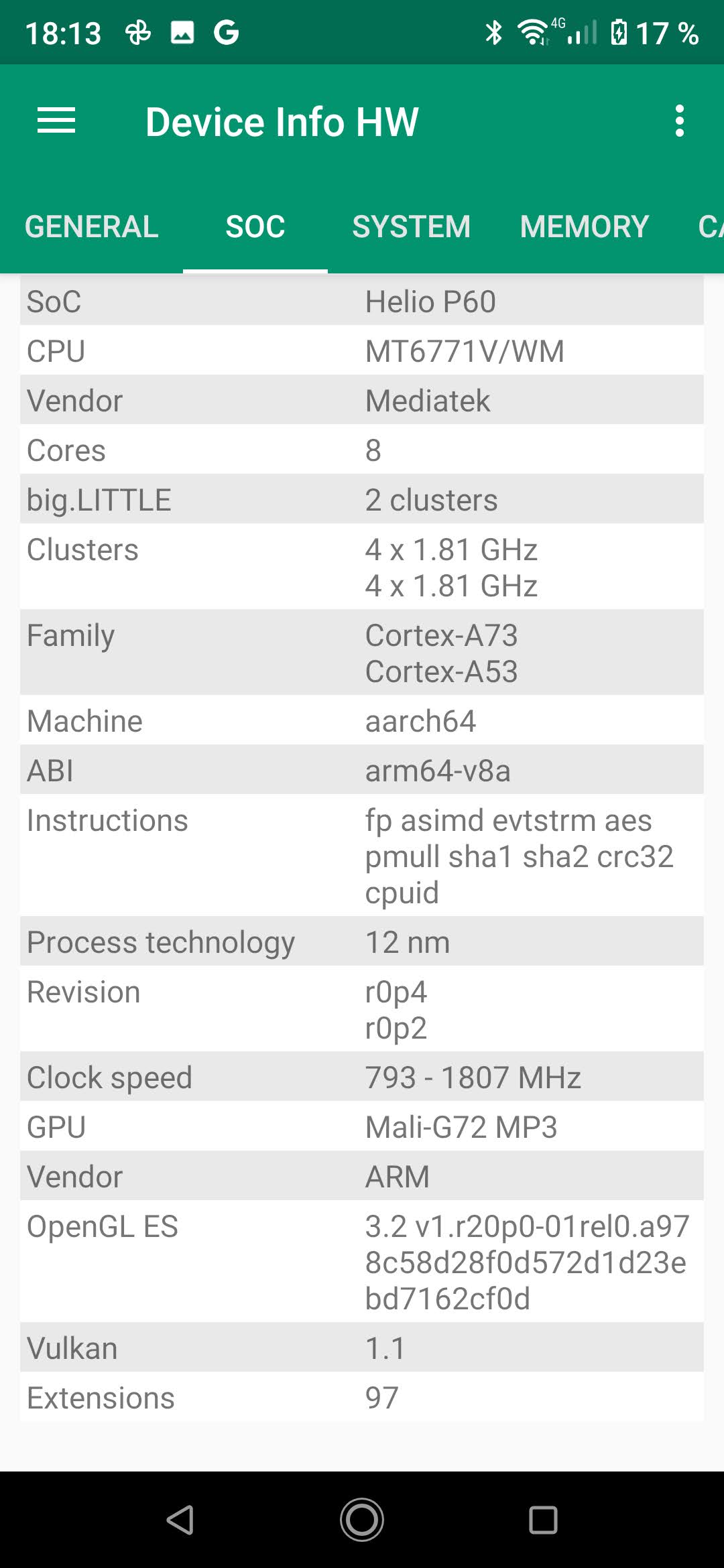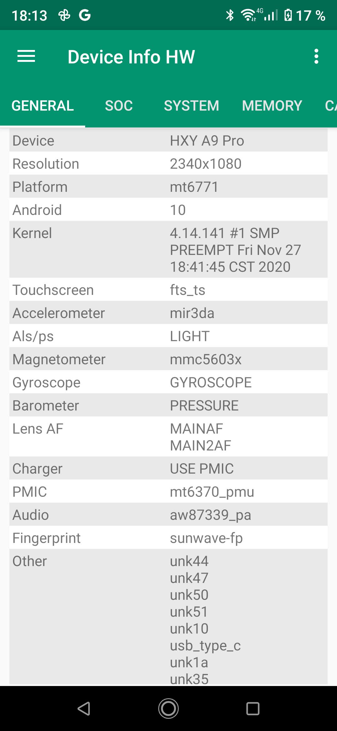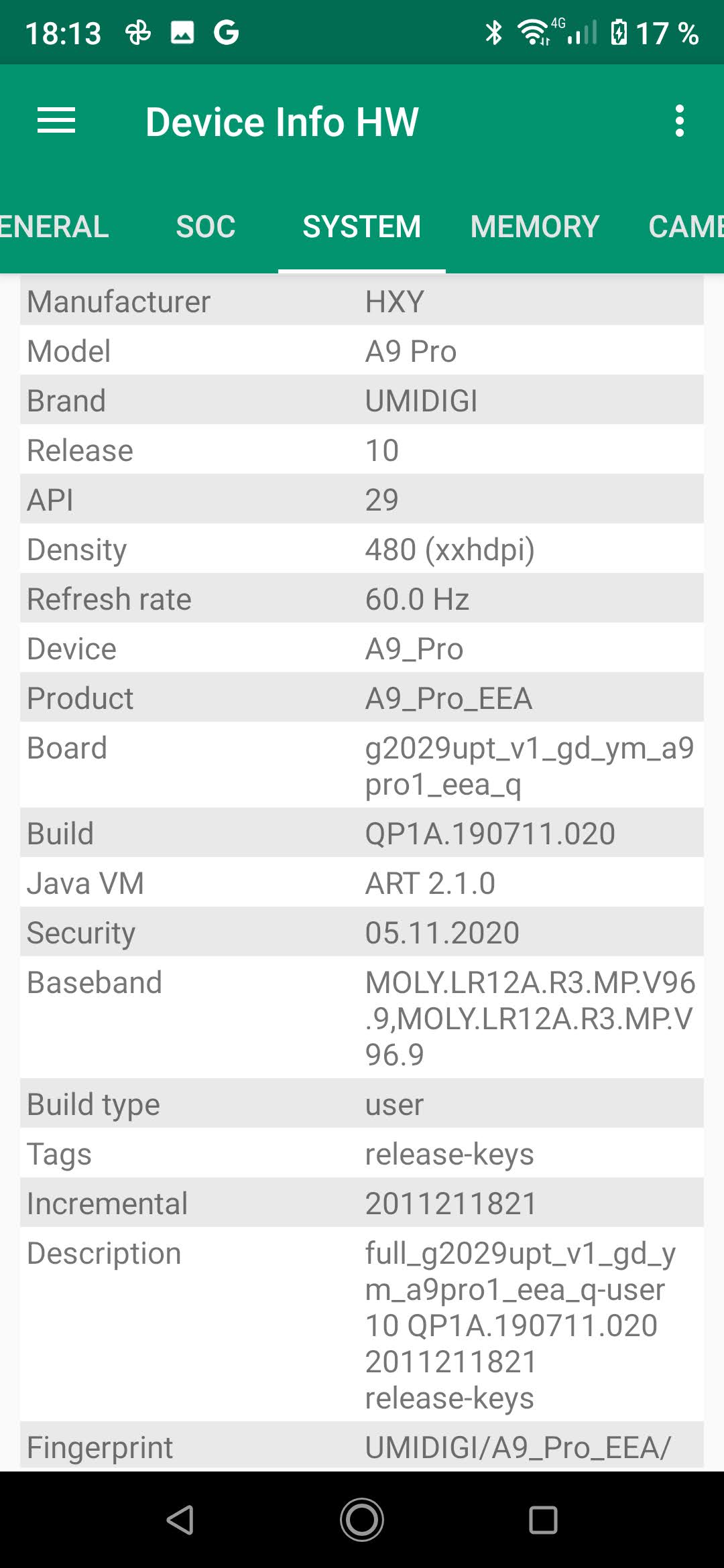 Les informations ci-dessous proviennent de l'application Device Info HW. L'application fournit des informations techniques détaillées sur le téléphone testé.J'ai acheté la version 4Gb / 64 Gb, les caractéristiques détaillées du Umidigi A9 Pro sont disponibles dans les captures d'écrans suivantes: