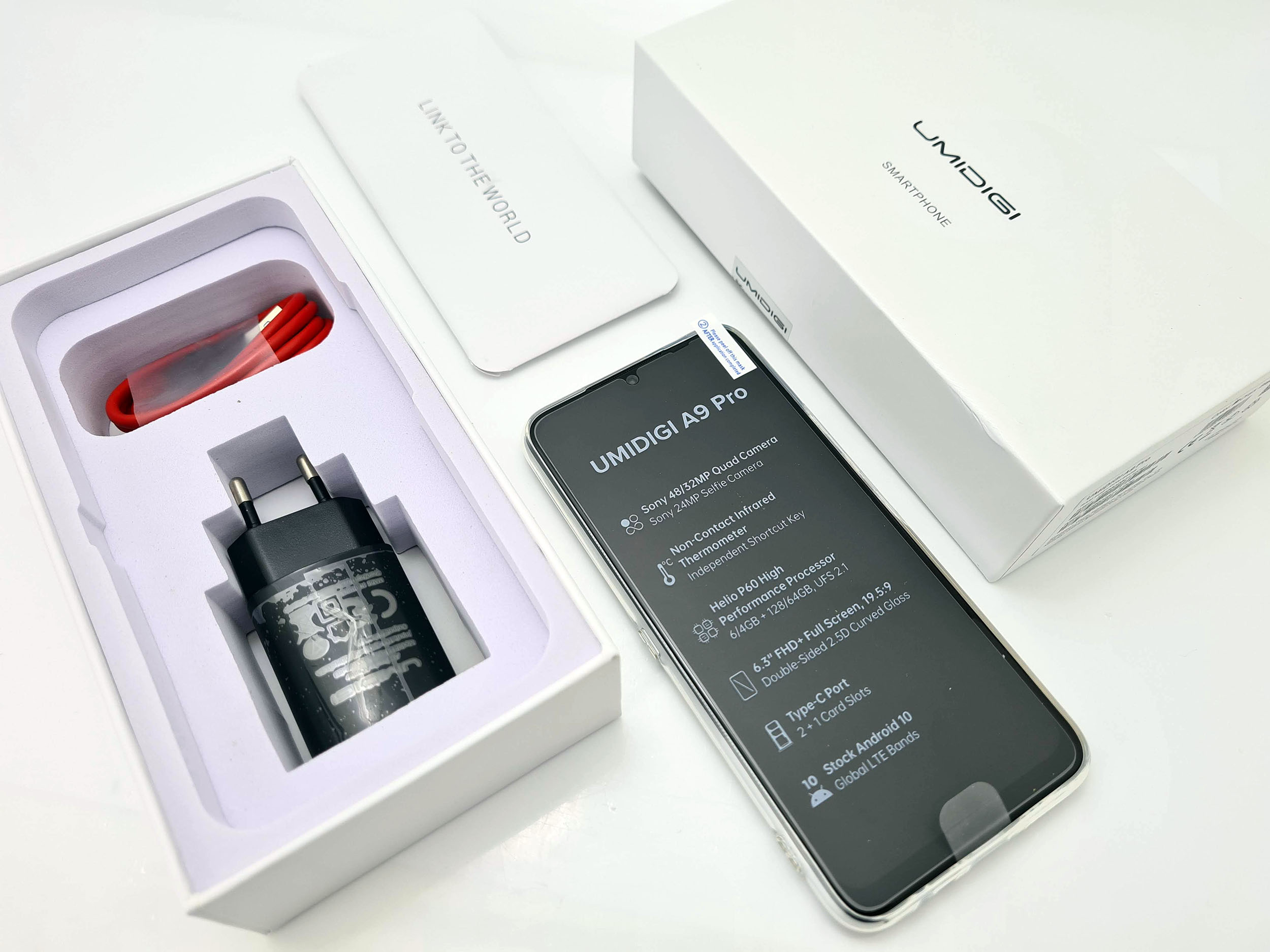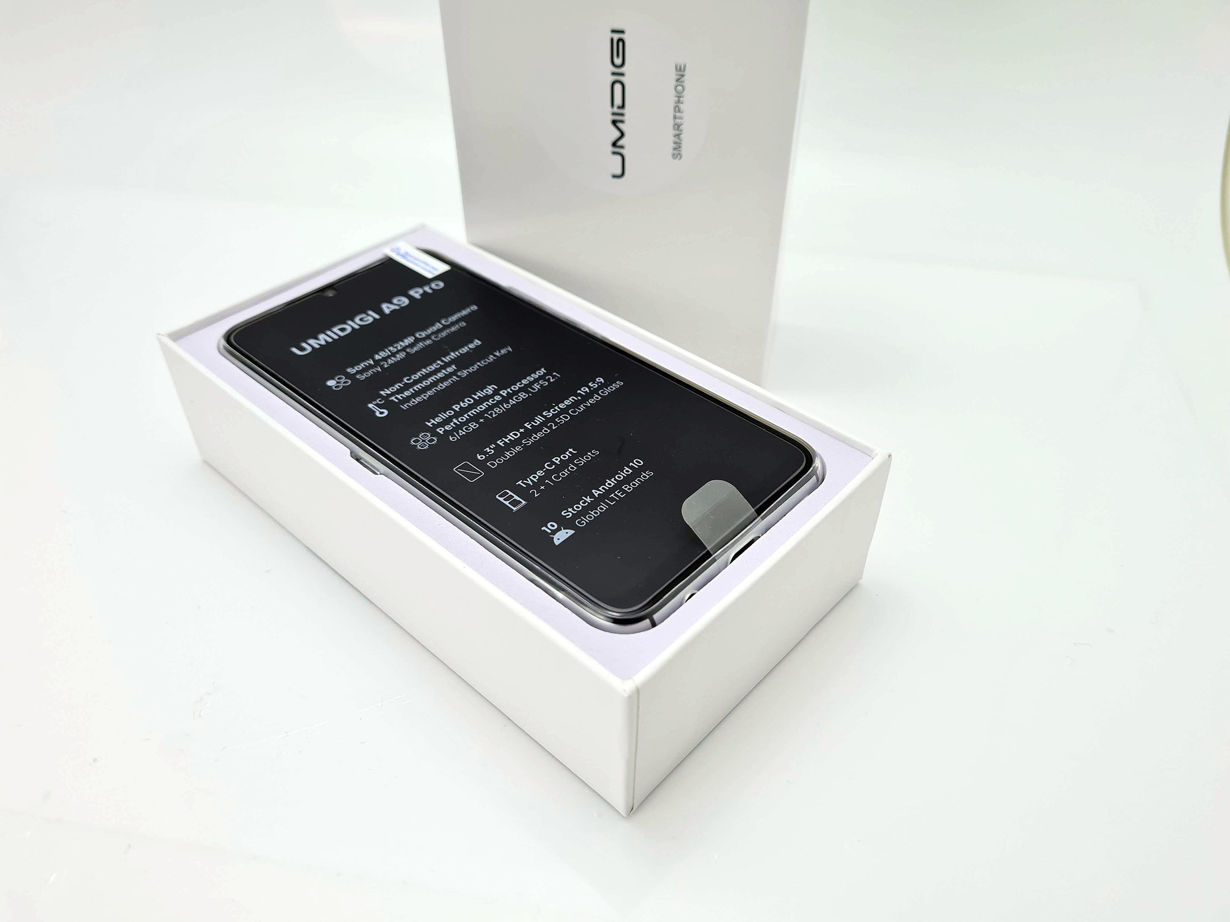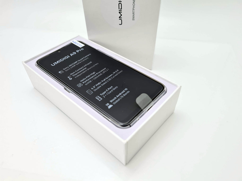 La boite du Umidigi A9 Pro est presque anonyme, elle est toute blanche avec un logo Umidigi. Elle contient le téléphone ainsi qu'un chargeur, un cable usb, un manuel, une protection souple transparente, un aiguille pour le tiroir sim et un manuel.