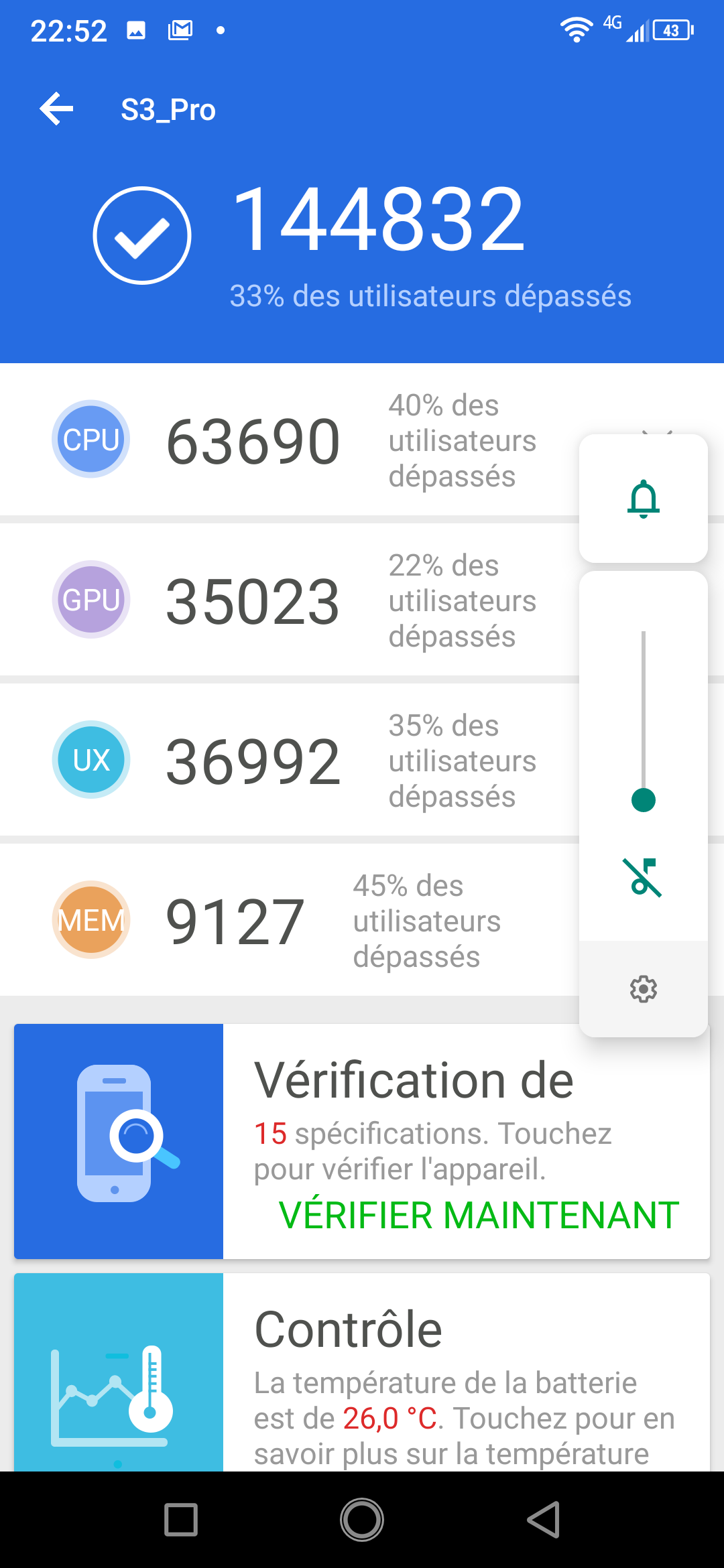 Le Umidigi S3 Pro est équipé d'un processeur MediaTek Helio P70 et d'un chipset graphique ARM Mali G72 qu'il partage avec le Umidig F1. Dans ce positionnement de prix, le Umidigi entre en compétition avec le Redmi Note 7 ou le Xiaomi Mi 8 Lite avec le Qualcomm Snapdragon 660. Avec Antutu j'obtiens un score de 144832 points, ce score est tout à fait comparable au Redmi Note 7 (143242 points) mais la différence se situe surtout au niveau du prix où on trouve un Redmi Note 7 entre 50 et 100€ en dessous du S3 Pro. Le S3 Pro délivre une bonne performance mais le rapport prix/performance est en faveur du Redmi Note 7.