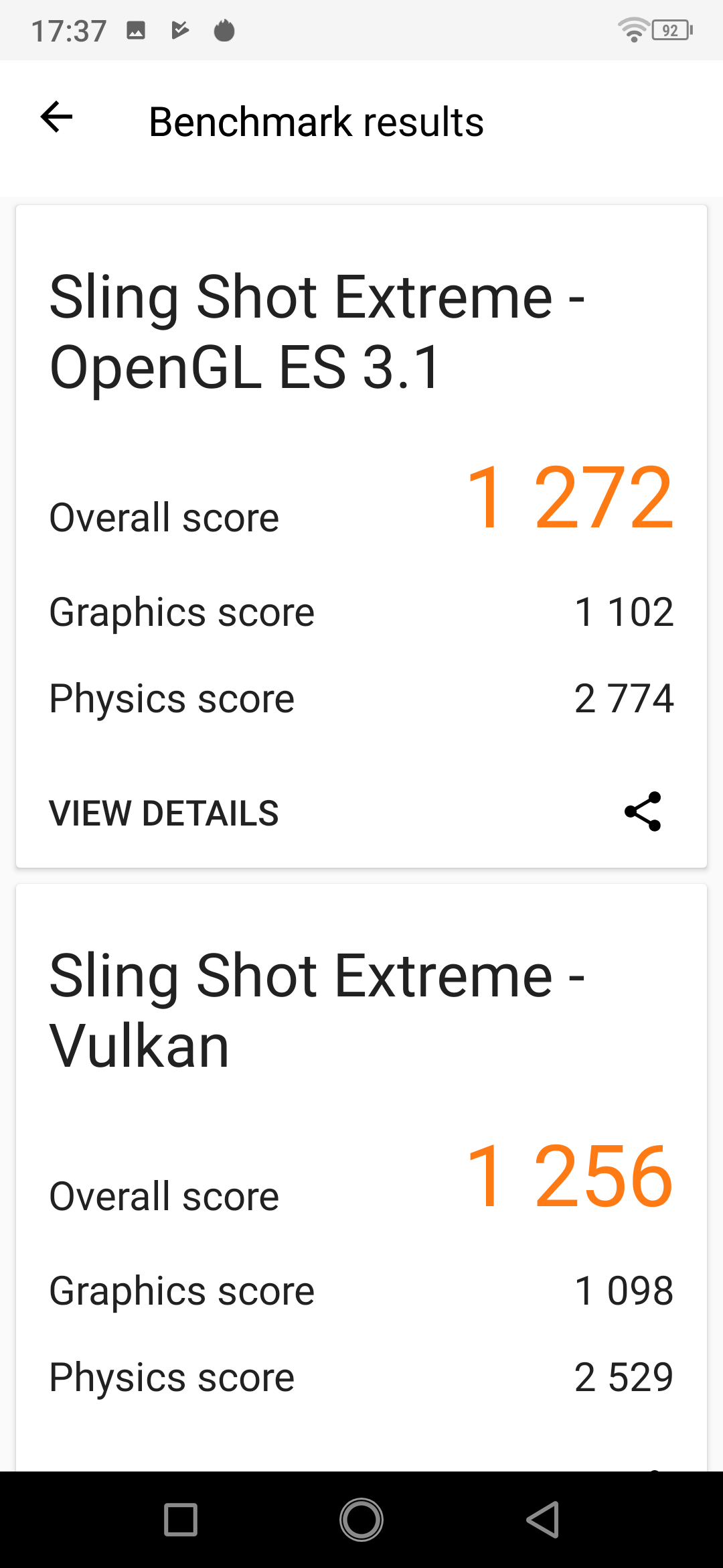 Le benchmark avec 3Dmark aboutit à un score de 1272 points pour OpenGL et 1256 pour Vulkan. Ces scores sont bons mais pas les meilleurs parmi les appareils que j'ai testés. Le Redmi Note 7 et le Mi 8 Lite font mieux.