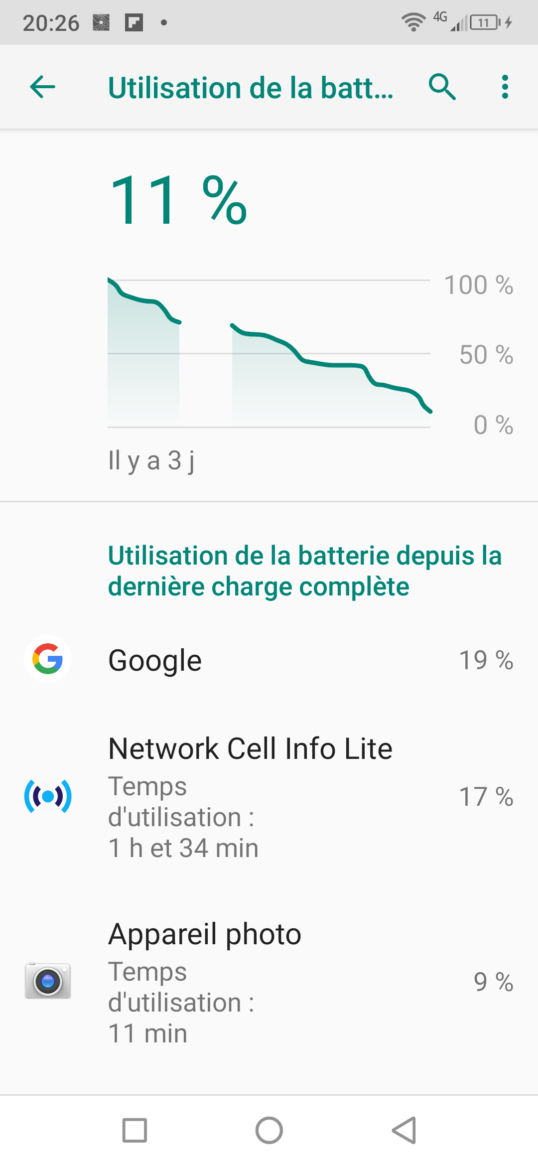 Avec ma consommation, je tiens entre 2 et 3 jours. Sur les images suivantes vous pouvez constater qu'après 3 jours (et une nuit d'interruption) la batterie était encore à 11%. Le S3 Pro est livré avec un chargeur rapide qui permet de recharger le téléphone en 2h - 2h30 mais si vous ne voulez pas attendre aussi longtemps, sachez qu'une heure de charge vous ramènera déjà aux environs des 50%.