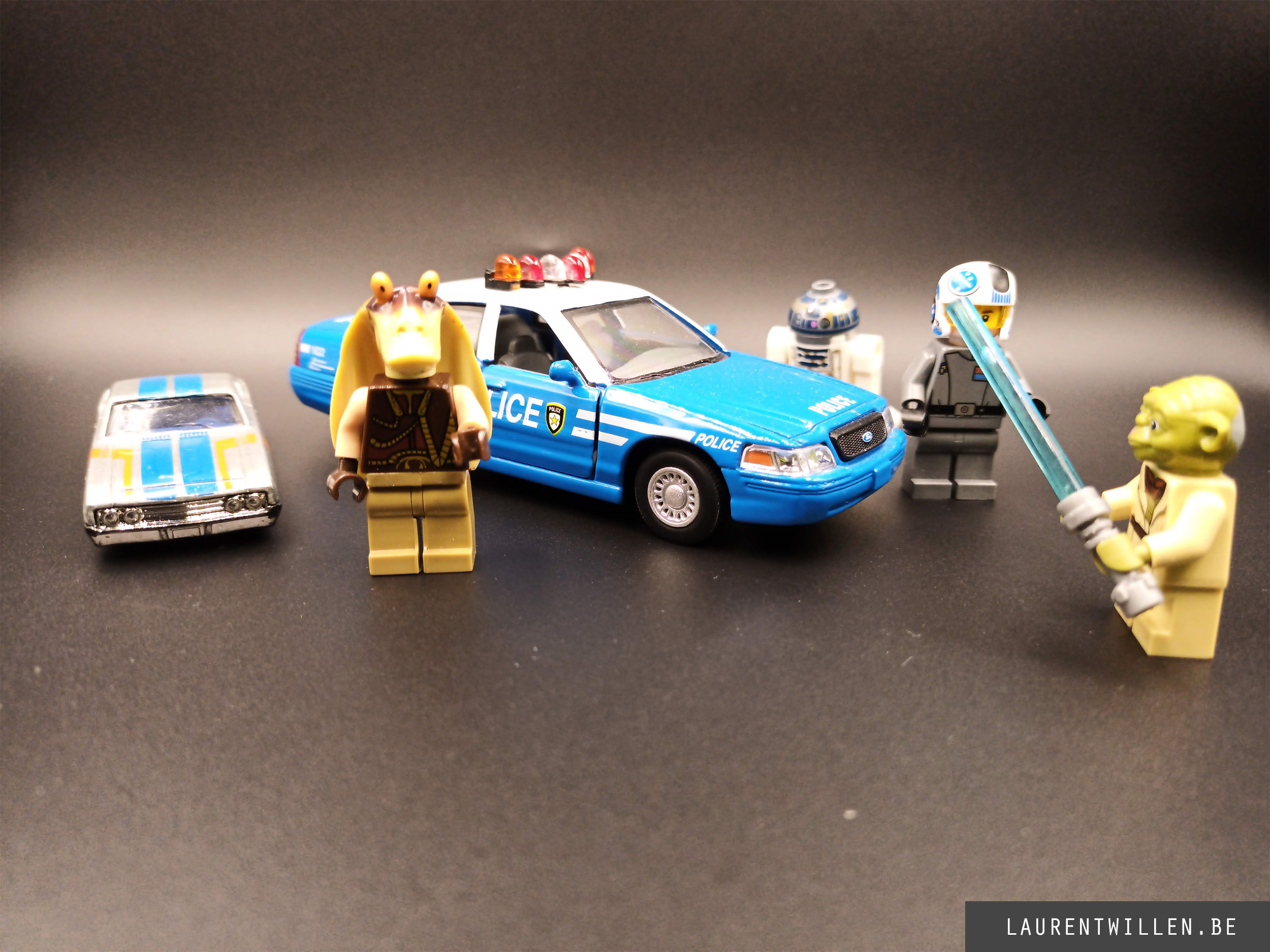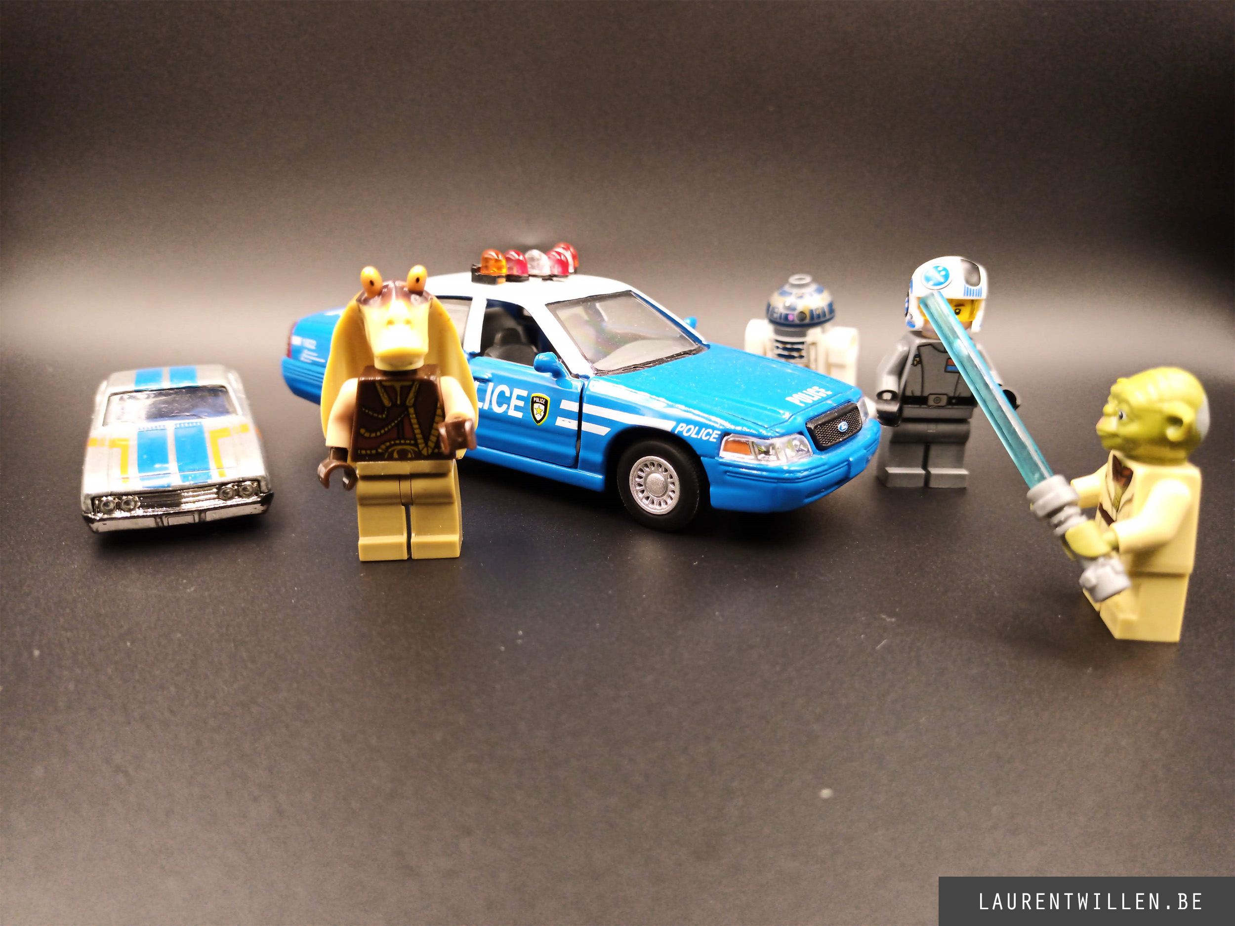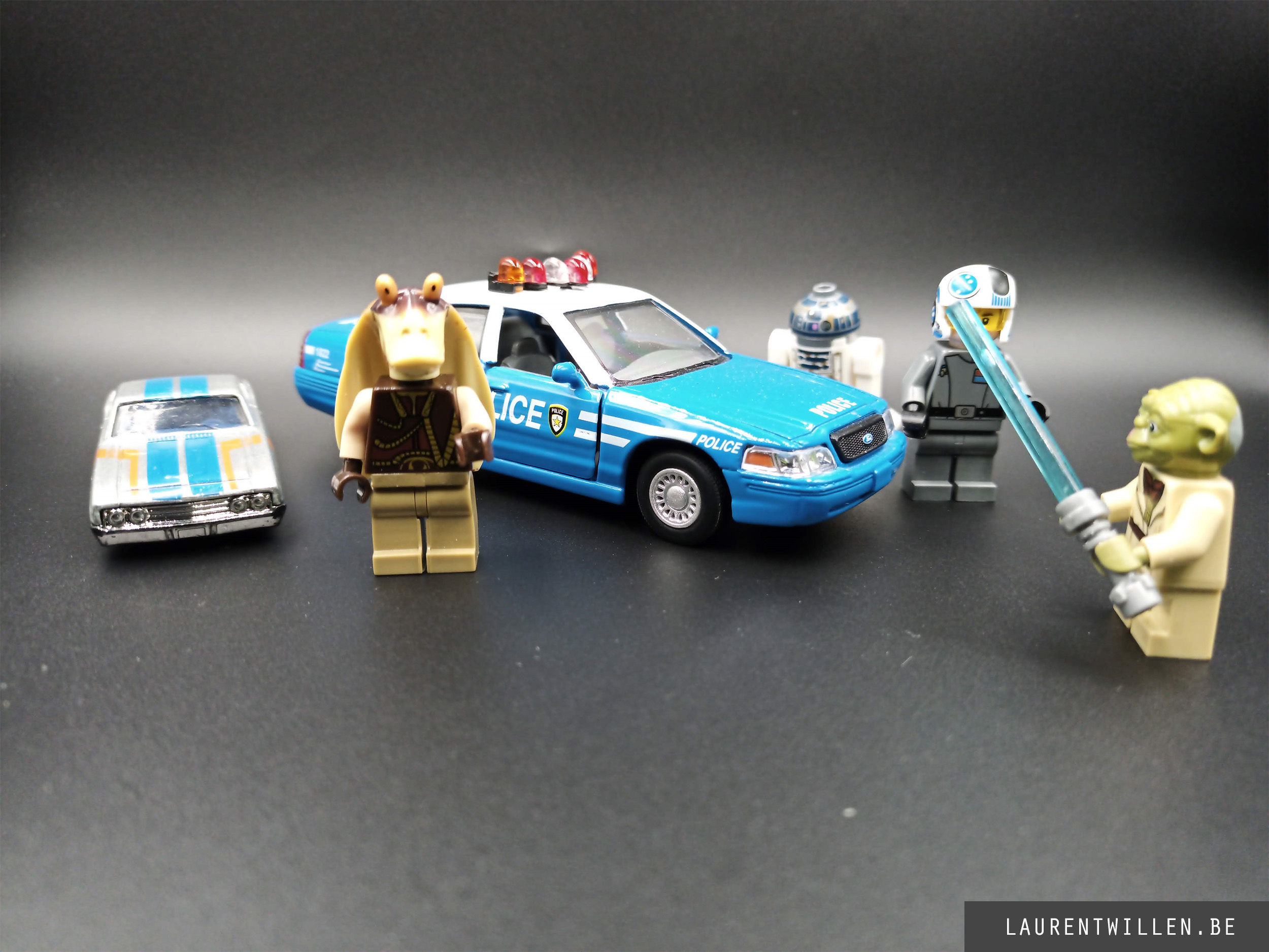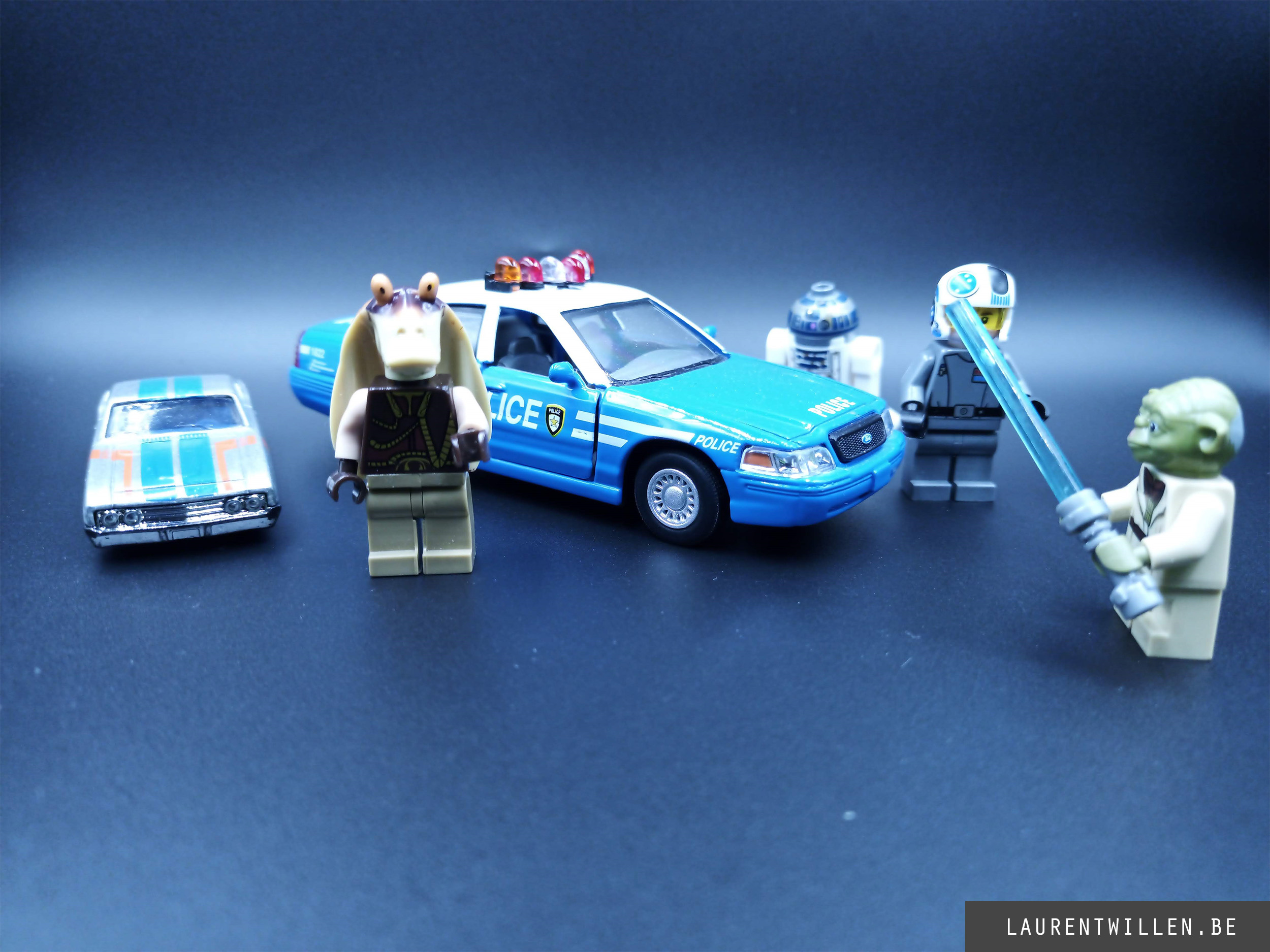 Pour faire mon test studio, j'ai repris quelques jouets de mon fils avec toujours la voiture de police bleue qui est reprise dans tous mes tests. Le focus de la photo est d'ailleurs fixée sur la voiture de police. J'ai fixé la position du S3 Pro pour pouvoir tester les différents modes sans bouger l'appareil. J'ai ensuite placé le Redmi Note 7 au même endroit pour pouvoir comparer les appareils dans des conditions strictement identiques.