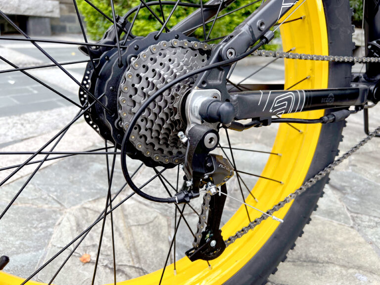 Le Bezior X1500 est équipé d'un moteur de 1500 W (puissance max, en réalité ce vélo produit 960W) à l'arrière qui est accompagné par une configuration de 9x3 vitesses (marque Shimano). Vous pouvez changer les vitesses à partir du guidon avec un levier pour le plateau et un autre pour la cassette.