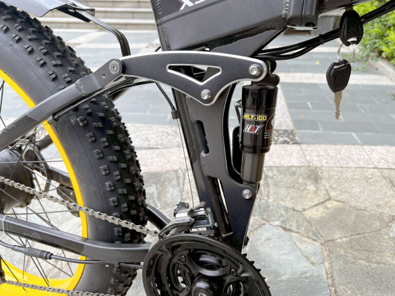 Il est équipé de deux amortisseurs double ressort à huile, un au niveau de la fourche et un autre en dessous de la selle. La plupart des fat bikes n'est équipé que d'un seul amortisseur à l'avant mais la présence du second amortisseur vient encore renforce l'idée que ce vélo est conçu pour rouler dans des conditions difficiles.