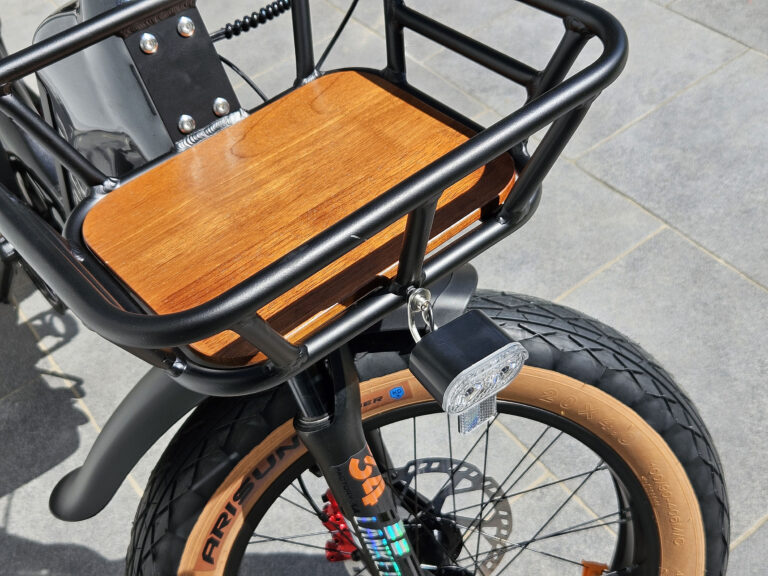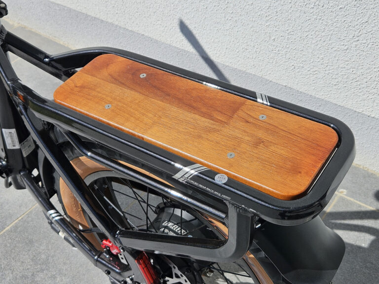 Le vélo est équipé d'un porte bagage déjà monté, il n'est d'ailleurs pas amovible, il fait partie du cadre. Le porte-bagage est recouvert d'une planche en bois reprenant la couleur de la selle et des poignées. L'utilisation du bois donne une touche plus chaleureuse au vélo mais je me dis que cette surface pourrait être glissante. Il est aussi possible d'installer des supports pour les pieds de chaque côté du vélo pour que quelqu'un puisse s'assoir sur le porte-bagage en poser ses pieds sur un support fixe.