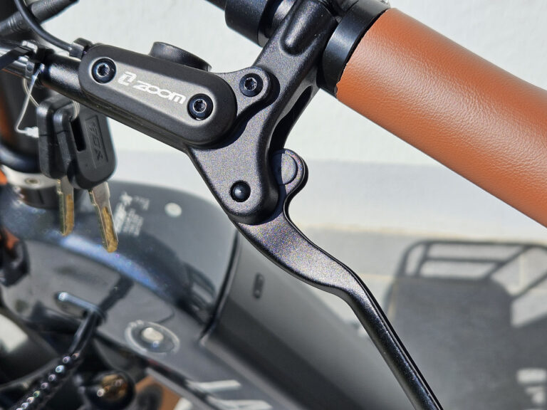 Les freins sont des freins de la marque Zoom comme sur les autres modèles. La configuration est ici inversée par rapport à un vélo classique, il faut donc un temps d'adaptation pour avoir le bon reflexe mais de toute façon, je conseille d'utiliser les deux freins en même temps pour un freinage plus efficace.