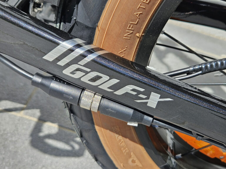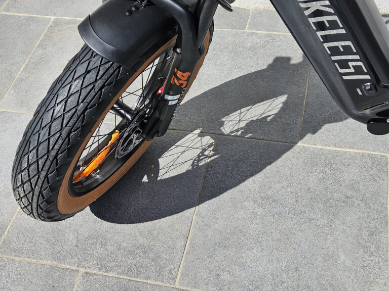 Le Lankeleisi Golf X a un air de famille avec les autres fat bikes de Lankeleisi. Le cadre a la même forme, le vélo est pliable et il s'agit d'une configuration avec des pneus de 20 pouces. Pourtant le public cible et l'utilisation seront sans doute totalement différents. Le vélo pèse 37 kg, il peut supporter une charge jusqu'à 200 kg (avec max 100 kg sur le porte-bagage). Le vélo est adapté aux tailles entre 160 cm et 195 cm...ouf, je mesure 194 cm mais avec un tube de selle aussi long, je pense que ça devrait aller.