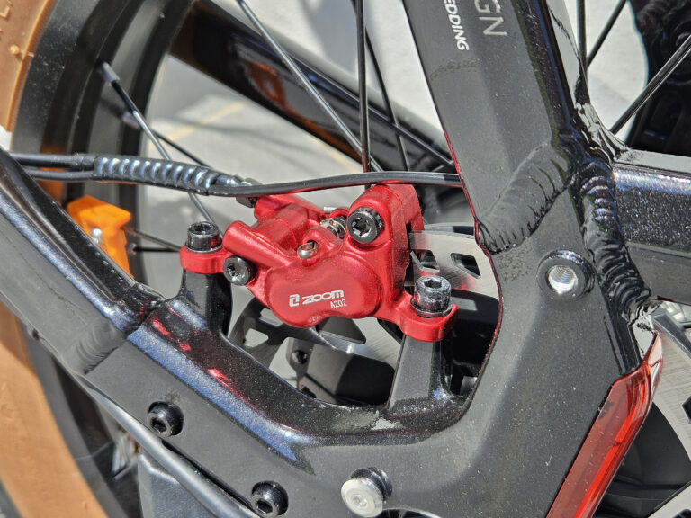 Le vélo est équipé de freins à disque hydrauliques de la marque Zoom. Je pense qu'il s'agit des mêmes freins que sur les autres modèles que j'ai testés. Si c'est le cas, ils auront sans les mêmes forces et faiblesses. Le frein arrière n'est sans doute pas assez puissant pour arrêter le vélo rapidement, il faudra sûrement utiliser les deux freins pour un freinage vraiment efficace. Je vais également vérifier ce point pendant mon test sur route.