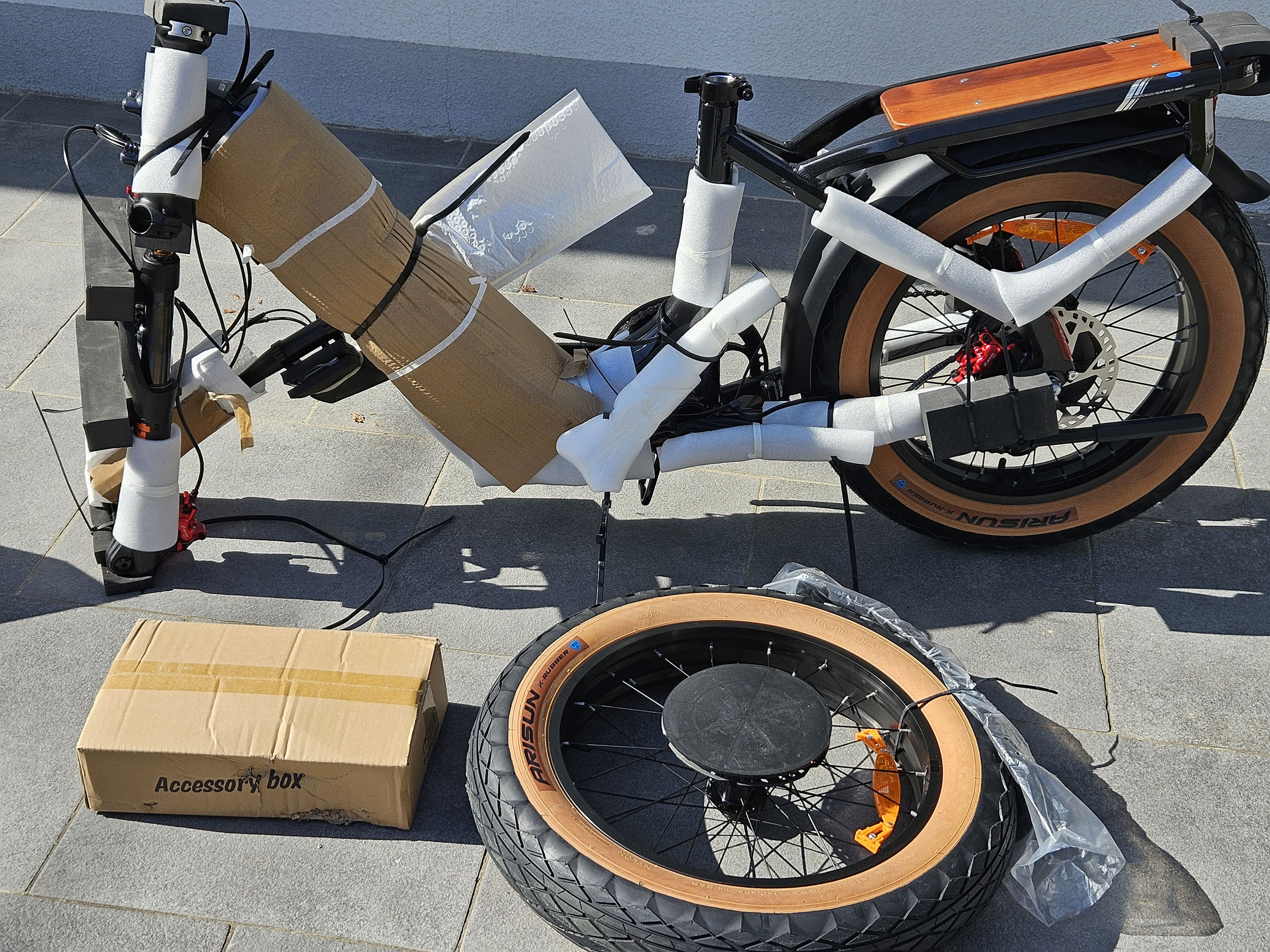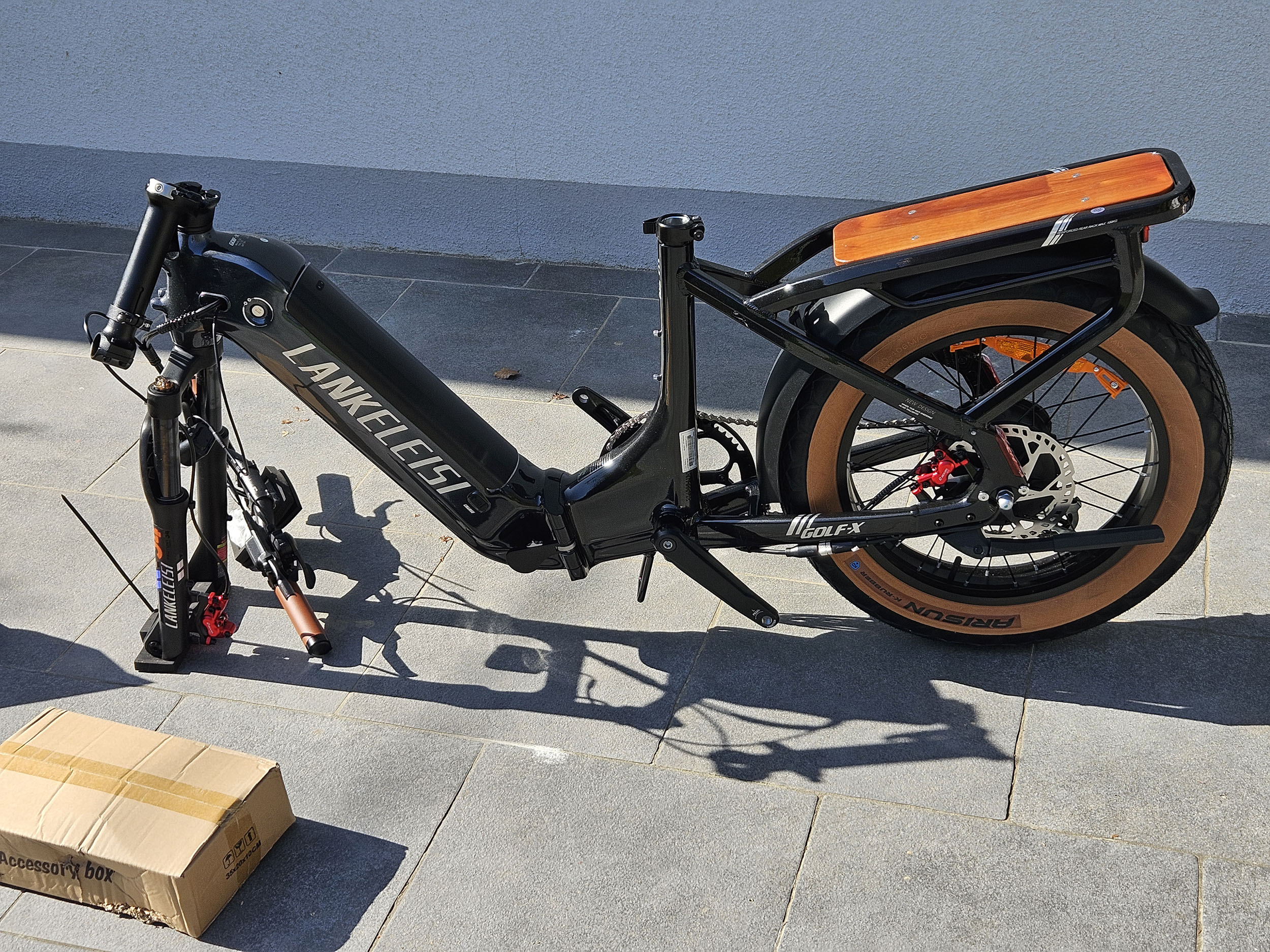 Le Lankeleisi Golf X est moins imposant que le RV800 Plus que j'ai testé l'année passée mais il est quand même très lourd, il pèse 37 kg et avec les accessoires la boite doit peser près de 40 kg. Le vélo est presque intégralement monté dans la boite. Il faut juste redresser le guidon, installer les garde-boue, fixer la selle, installer le panier et la lampe avant et finalement mettre la roue. Le processus est assez simple mais j'ai perdu un temps bête avec ... le garde-boue avant! La vis qui permet de l'attacher au vélo est trop courte, j'ai donc du forcer un peu les attaches pour que la vis puisse toucher les deux bouts.