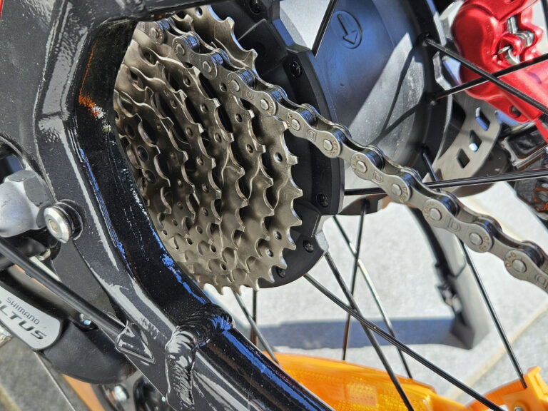 La cassette est composée de 7 vitesses avec un dérailleur Shimano. Je n'ai pas reçu l'info sur la configuration mais elle sera sans doute similaire au X3000 Max avec 14 dents pour le plus petit palier. Avec une configuration 52x14, vous allez avoir la possibilité de continuer à pédaler au delà du bridage du moteur pour gagner en vitesse sans l'aide du moteur.