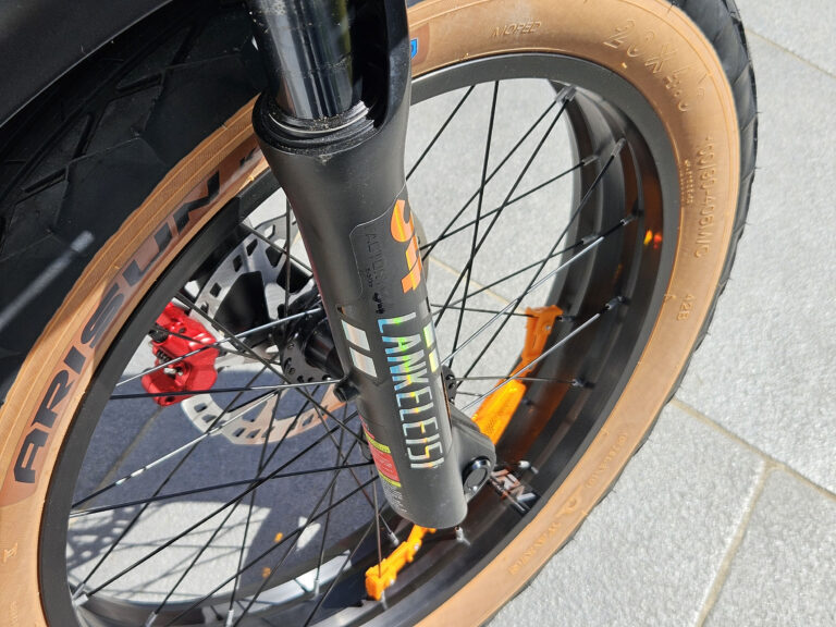 Les pneus sont assez imposants par rapport à ce type de vélo, ce sont des pneus de 20 pouces sur 4 pouces de la marque Arisun. Je n'ai pas encore testé de pneus de cette marque. Ils ont la particularité d'être bicolore avec une couleur rappelant la couleur de la selle, du porte-bagage et des poignées. Il y a ici clairement une volonté de créer une esthétique plus harmonieuse que sur les fat bikes habituels.