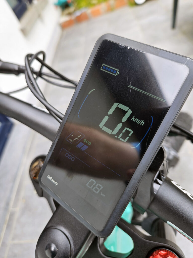 L'écran aussi est identique en tout point aux autres modèles et je peux donc déjà dire que le problème de luminosité sera également bien présent sur ce vélo. L'écran se transforme en miroir lorsque la luminosité est forte et ceci rend l'écran absolument illisible (sauf la vitesse).