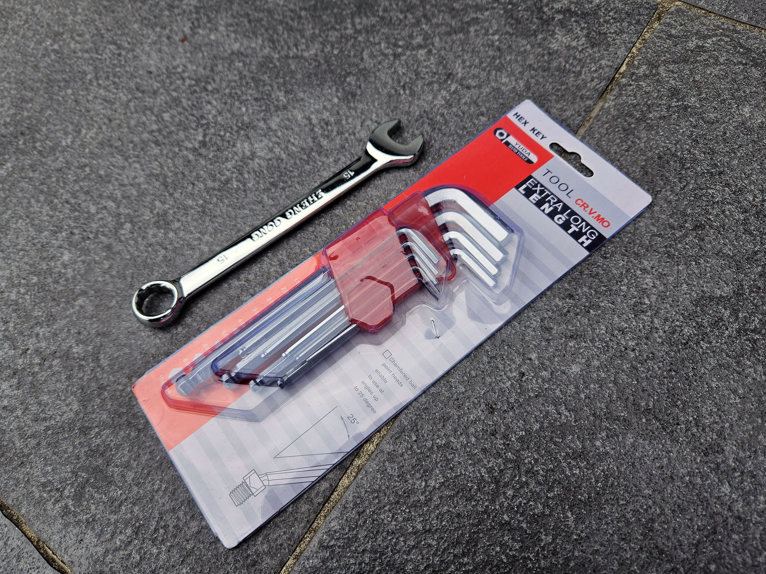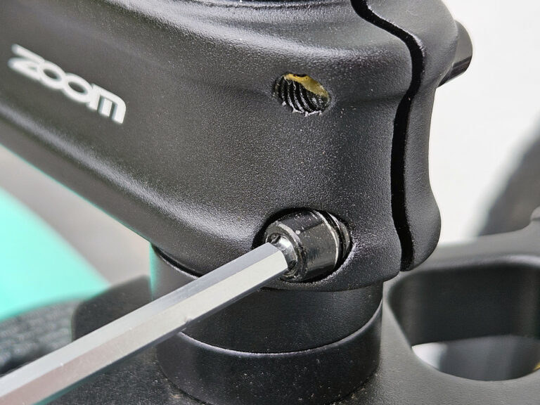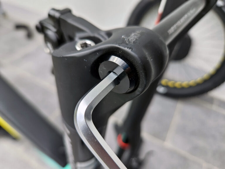 Il faut bien vous assurer que tout soit dans le bon axe pour éviter d'avoir un guidon légèrement de travers. Je suggère de faire glisser une des clés de la façon suivante pour avoir un alignement parfait entre le cadre et le support.